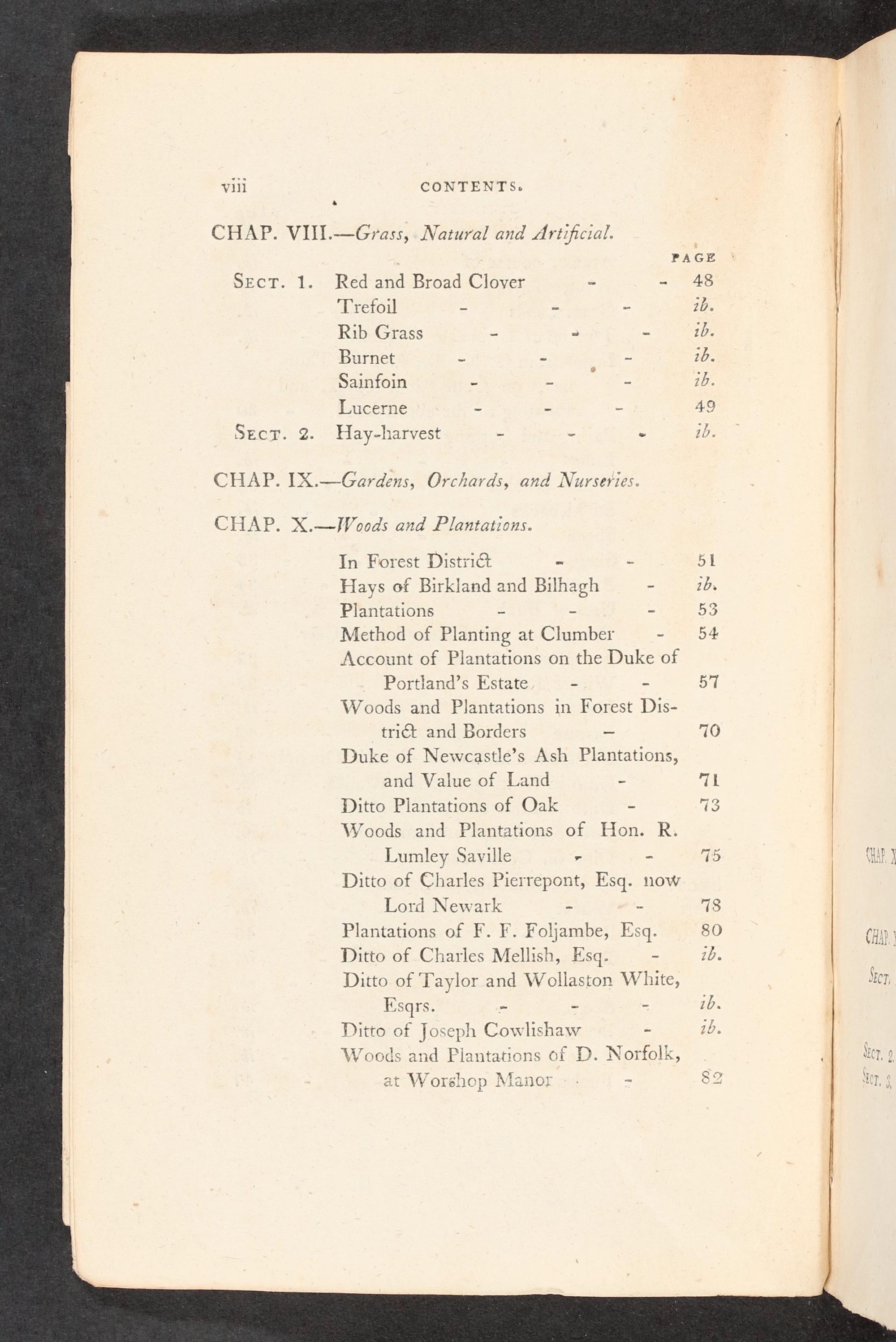 Red and Broad Clover-= 46 Trefoil=-- 1b. Rib Grass--= ib. Burnet S-~ 1b. Sainfoin Z ee ib. Lucerne-== 49 Hay-harvest-=~ 1D. CHAP. IX.—Gardens, Orchards, and Nurseries. CHAP. X.—Woods and Plantations. In Forest District~- 51 Hays of Birkland and Bilhagh- ib. Plantations==- 53 Method of Planting at Clumber~. 54 Account of Plantations on the Duke of Portland’s Estate=- 57 Woods and Plantations in Forest Dis- trict and Borders~ 70 Duke of Newcastle’s Ash Plantations, and Value of Land- get Ditto Plantations of Oak- 1s Woods and Plantations of Hon. R. Lumley Saville,- 75 Ditto of Charles Pierrepont, Esq. now Lord Newark-- 78 Plantations of F. F. Foljambe, Esq. 80 Ditto of Charles Mellish, Esq.= ib. Ditto of Taylor and Wollaston White, Esqrs.-=- ib. Ditto of Joseph Cowlishaw- 1b Woods and Plantations of D. Norfolk, at Worshop Manor.~ 82