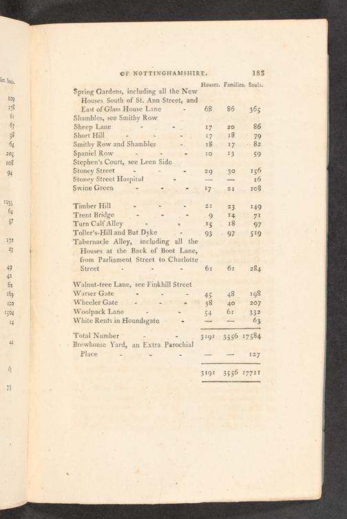 10) Houses South of St. Ann Street, and 178 East of Glass House Lane- 68 86 365 60 Shambles, see Smithy Row 67 Sheep Lane-- 17 20 86 98 Short Hill-:- T7648 79 64 Smithy Row and Shambles- 18 LZ ge BE 206 Spaniel Row--© 10 13 59 108 Stephen’s Court, see Leen Side 94 Stoney Street--- 29 30 156 Stoney Street Hospital-==e 16 Swine Green--“ 17 21 108 1°35 Timber Hill.-~ 21 23 149 % Trent Bridge--- 9 14 71 7 Turn Calf Alley-= 15 18 97 Toller’s-Hill and But Dyke- 93 97 519 Ve Tabernacle Alley, including all the 3| Houses at the Back of Boot Lane, | from Parliament Street to Charlotte 49 Street--- 61 61 284 62| Walnut-tree Lane, see Finkhill Street 169 Warser Gate:-- 45 48 198 120 Wheeler Gate-- 2 38 40 207 1504 Woolpack Lane-~ 54 61 332 14| White Rents in Houndsgate.—_— 63 Total Number-- 3Igt 3556 17584 4 Brewhouse Yard, an Extra Parochial Place---—— 129 6