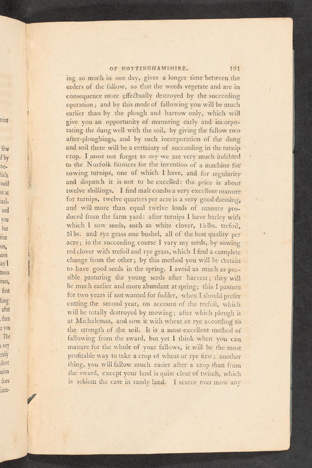 OF NOTTINGHAMSHIRE. 19k ing so much in one day, gives a longer time between the orders of the fallow, so that the weeds vegetate and are in consequence more effectually destroyed by the succeeding operation; and by this mode of fallowing you will be much earlier than by the plough and harrow only, which will give you an opportunity of manuring early and incorpo- rating the dung well with the soil, by giving the fallow two after-ploughings, and by such incorporation of the dung and soil there will be a certainty of succeeding in the turnip crop. I must not forget to say we are very much indebted to the Norfolk farmers for the invention of a machine for sowing turnips, one of which| have, and for regularity and dispatch it is not to be excelled: the price is about twelve shillings. I find malt combsa very excellent manure for turnips, twelve quarters per acre is a very good dressing, and will more than equal twelve loads of manure pro- duced from the farm yard: after turnips I have barley with which I sow seeds, such as white clover, 15lbs. trefoil, 5lbs. and’ rye grass one bushel, all of the best quality per acre; in the succeeding course I vary my seeds, by sowing red clover with trefoil and rye grass, which I find a complete change from the other; by this method you will be certain to have good seeds in the spring. I avoid as muchas pos- sible pasturing the young seeds after harvest; they will be much earlier and more abundant at spring; this I pasture for two years if not wanted for fodder, when I should prefer cutting the second year, on account of the trefoil, which will be totally destroyed by mowing; after which plough it at Michalemas, and sow it with wheat or rye according to the. strength of the soil. It is a most-excellent method of fallowing from the sward, but yet I think-when you can manure for the whole of your fallows, it will be the most profitable way to take a crop of wheat or rye first; another thing, you will fallow much easier after'a crop than from the sward, except your land is quite clear of twitch, which is seldom the case in sandy land. I scarce ever mow any
