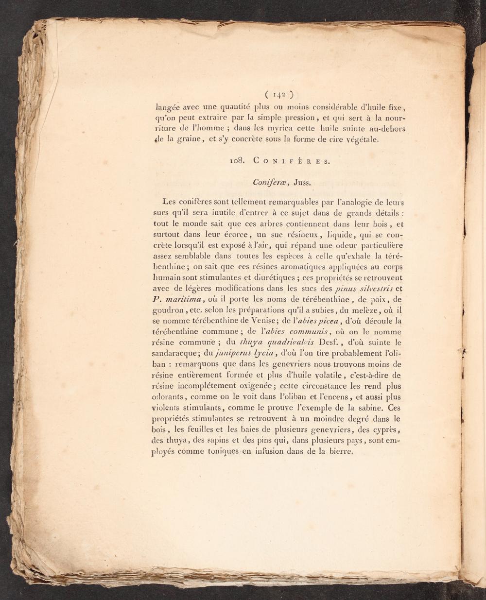 Les conifères sont tellement remarquables par l'analogie de leurs sucs qu'il sera inutile d’entrer à ce sujet dans de grands détails: tout le monde sait que ces arbres contiennent dans leur bois, et surtout dans leur écorce, un suc résineux, liquide, qui se con- crète lorsqu'il est exposé à l'air, qui répand une odeur particulière assez semblable dans toutes les espèces à celle qu’exhale la téré- benthine; on sait que ces résines aromatiques appliquées au corps humain sont stimulantes et diurétiques; ces propriétés se retrouvent avec de légeres modifications dans les sucs des pinus silvestris et P. maritima, où il porte les noms de térébenthine, de»oix, de goudron, etc, selon Îles préparations qu’il a subies, du melèze, où il se nomme térébenthine de Venise; de l’abies picea, d'où découle la térébenthine commune; de l’abres communis, où on le nomme résine commune; du /huya quadrivalvis Desf., d’où suinte le sandaracque; du Juriperus lyeia, d’où l’on tire probablement loli- ban: remarquons que dans les genevriers nous trouvons moins de résine entièrement formée et plus d'huile volatile, c’est-à-dire de résine incomplétement oxigenée; cette circonstance les rend plus odorants, comme on le voit dans l’oliban et l'encens, et aussi plus violents stimulants, comme le prouve l’exemple de la sabine. Ces propriétés stimulantes se retrouvent à un moindre degré dans le bois, les feuilles et les baies de plusieurs genevriers, des cyprès, des thuya, des sapins et des pins qui, dans plusieurs pays, sont em- ployés comme toniques-en infusion dans de la bierre,