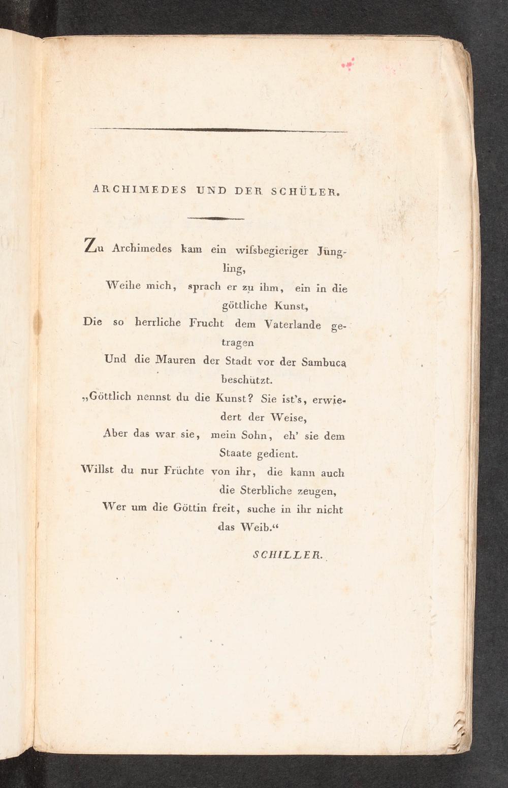 En Archimedes kam ein wilsbegieriger Jüng- ling, Weihe mich, sprach er zu ihm, ein in die göttliche Kunst, Die so herrliche Frucht dem Vaterlande ge- tragen Und die Mauren der Stadt vor der Sambuca beschützt. „Göttlich nennst du die Kunst? Sie ist’s, erwie« dert der Weise, Aber das war sie, mein Sohn, ch’ sie dem Staate gedient. Willst du nur Früchte von ihr, die kann auch die Sterbliche zeugen, Wer um die Göttin freit, suche in ihr nicht