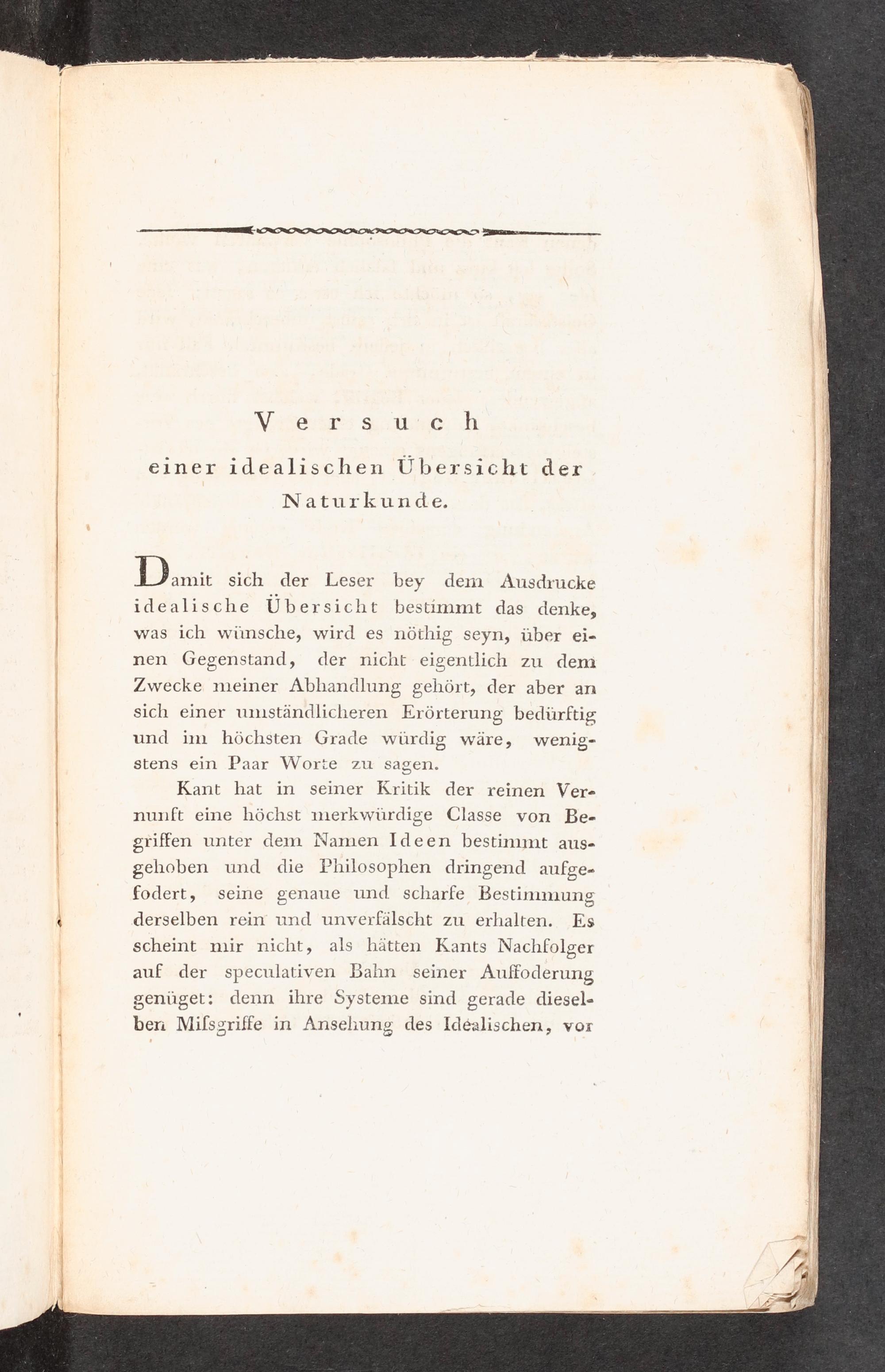 Kant hat in seiner Kritik der reinen Ver- nunft eine höchst merkwürdige Classe von Be- griffen unter dem Namen Ideen bestimmt aus- gehoben und die Philosophen dringend aufge- fodert, seine genaue und scharfe Bestimmung derselben rein und unverfälscht zu erhalten. Es scheint mir nicht, als hätten Kants Nachfolger auf der speculativen Bahn seiner Auffoderung genüget: denn ihre Systeme sind gerade diesel- ben Mifsgriffe in Ansehung des Idealischen, vor