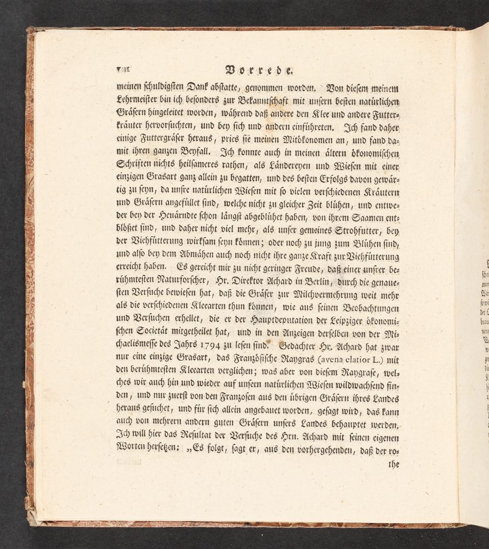 meinen ſjchuldigſten Dank abſtatte, genommen worden, Von dieſetty meinen Lehrmeiſter bin ich beſonders zur Bekanntſchaft mit unſern beſten natürlichen Gröſern hingeleitet worden, während daß andere den Klee und andere Futter, kräuter hervorſuchten, und bey ſich und andern einführeten, Ich fand daher. einige Futtergräſer heraus, pries ſie meinen Mitdkonomen an, und fand da- mit ihren ganzen Beyfall, Ich konnte auch in meinen ältern vfonomiſchen Schriften nichts heilſameres rathen, als Ländereyen und Wieſen mit einer einzigen Gragart ganz allein zu begatten, und des beſten Erfolgs davon gewär- tig zu ſeyn, da unſre natürlichen Wieſen mit ſo vielen verſchiedenen Kräutern und Gräſern angefüllet ſind, welche nicht zu gleicher Zeit blühen, und entwe- der bey der Heuärndte ſchon längſt abgeblühet haben, von ihrem Saamen ent- bldßet ſind, und daher nicht viel mehr, als unſer gemeines Strohfutter, bey der Viehfütterung wirkſam ſeyn können; oder noch zu jung zum Blühen ſind, und alſo bey dem Abmähen auch noch nicht ihre ganze Kraft zur Viehfütterung erreicht haben. Es gereicht mir zu nicht geringer Freude, daßeiner unſrer be- rühmteſten Naturforſcher, Hr. Direktor Achard in Berlin, durch die genaue- ſten Verſuche bewieſen hat, daß die Gräſer zur Milchvermehrung weit mehr als die verſchiedenen Kleearten thun können, wie aus ſeinen Beobachtungen und Verſuchen erhellet, die er der Hauptdeputation der Leipziger dkonomi-