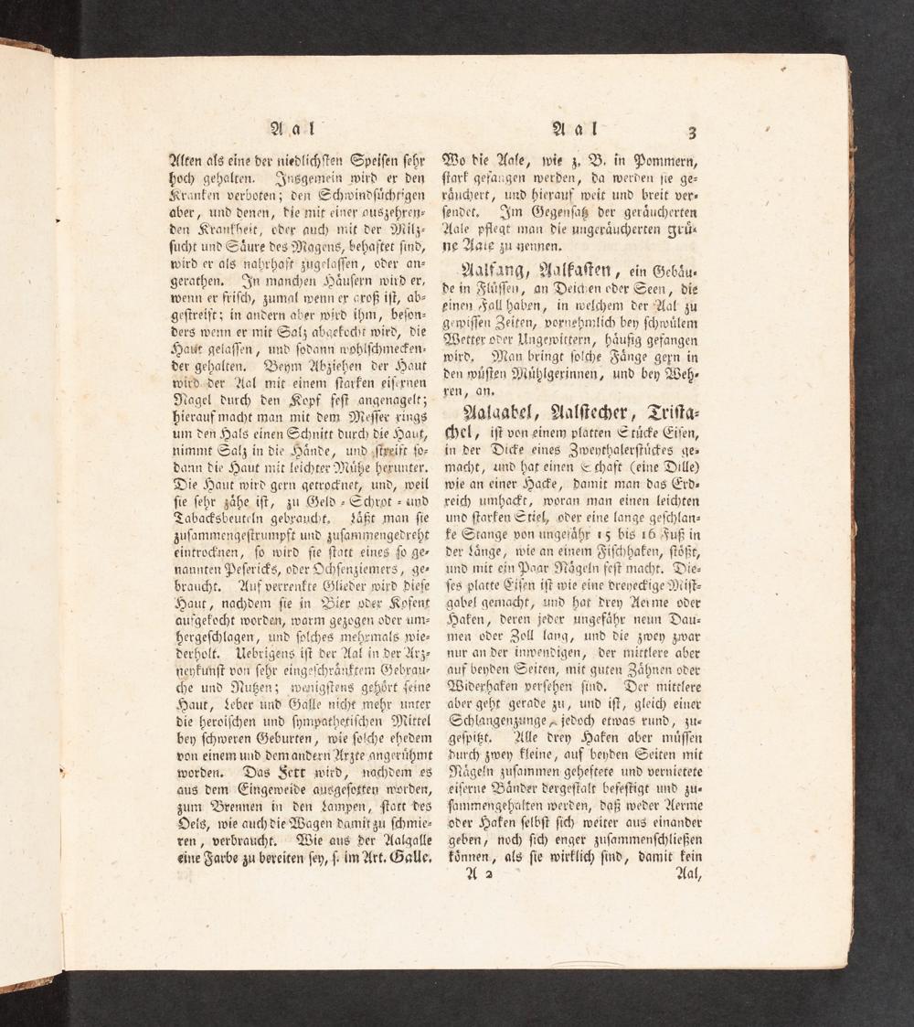 Aalaagbel, Aalſiecher, Triſta- hel, iſt von einem platten Etücke Eiſen, in der Dicke eines Zweythalerſtückes qe macht, und hat einen€ chaft(eine Dille) wie an einer Hacke, damit man das Erd- reich umhacft, woran man einen leichten und ſtarfen Stiel, oder eine lange geſchlan- ke Stange von ungefähr 15 bis 16 Fuß in der Länge, wie an einem Fiſchhafen, ſtößr, und mit ein Paar Nägeln feſt macht. Die- ſes platte Ciſen iſt wie eine dreye>ige Miſt- gabel gemacht, und hat drey Aerme oder Haken, deren jeder ungefähr neun Dau- men oder Zoll layq, und die zwey zwar nur an der inwendigen, der mittlere aber auf beyden Seiten, mit guten Zähnen oder Widerhaken verſehen ſind. Der mitelere aber geht gerade zu, und iſt, gleich einer Schlangenzunge« jedoch etwas rund, zu- geſpißt, Alle drey Haken aber müſſen durch zwey kleine, auf beyden Seiten mit Nageln zuſammen geheftete und vernietete eiſerne Bänder dergeſtalt befeſtigt und zu- fammengehälten werden, daß weder Aerme oder Haken ſelbſt ſich weiter aus einander geben, nod) ſich enger zuſammenſchließen können, als ſie wirklich ſind, damit kein