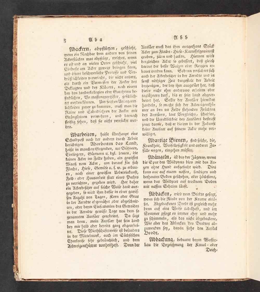 Abbacfen, wird vom Brodte geſagt, wenn ſic) die Rinde von der Krume abls- ſet. Abgeba&enes Brodt iſt zugleich mehr denn auf eine Weiſe tadelhaft, und int Sommer pflegt es immer eher und mehr zu ſchimmeln, als das nicht abgebactene, Wie aber das Abbacken des Brodtes ab- zuwenden ſey, davon ſiehe den Artikel 2Ir0dt. D