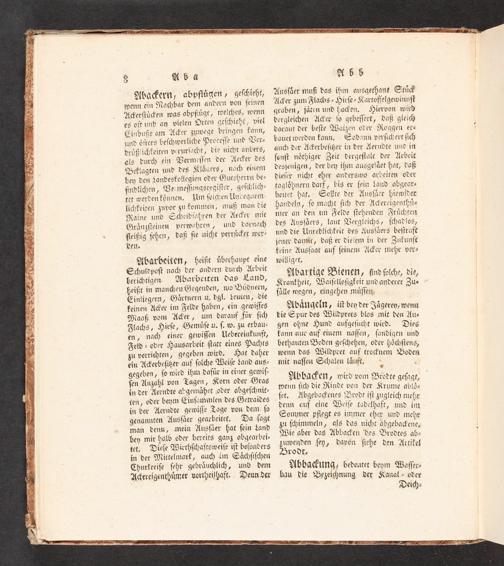 Abarbeiten, heißt überhaupt eine Schuldpoſt nach der andery dur Arbeit berichtigen. Abarbeiten das Land, Heißt in manchen Gegenden, wo Budnern, Einliegern, Gärtnern u. dgl. Leuten, die feinen Aer im Felde haben, ein gewiſſes Maaß vom Aer, um darauf für ſich Flachs, Hirſe, Lzemüſe u.|. w. zu erbau- en, nach einer gewiſſen Uebereinkunft, Jetd- oder Hausarbeit ſtatt eines Pachts zu verriegten, gegeben wird. Hat daher ein Akerbeſiker auf ſolche Weiſe Land aus- gegeben, ſo wird ihm dafür in einer gewiſ- ſen Anzahl von Lagen, Korn oder Gras in der Aerndte abgemähet oder abgeſchnif- ten, oder beym Einſammlen des Getraides in der Aerndte gewiſſe Tage von dem. ſo genannten Ausſäer gearbeitet. Da ſagt man denn, mein Ausfäer hat ſein Land bey mir hälb oder bereits ganz abgearbei- tet. Dieſe Wirthſchaftsweiſe yt beſonders in der Mittelmark, auc)<zm Sächſiſchen Churkreiſe ſehr gebräuchlich, und dem Acfereigenthümer vortheilhaft. Deun.der