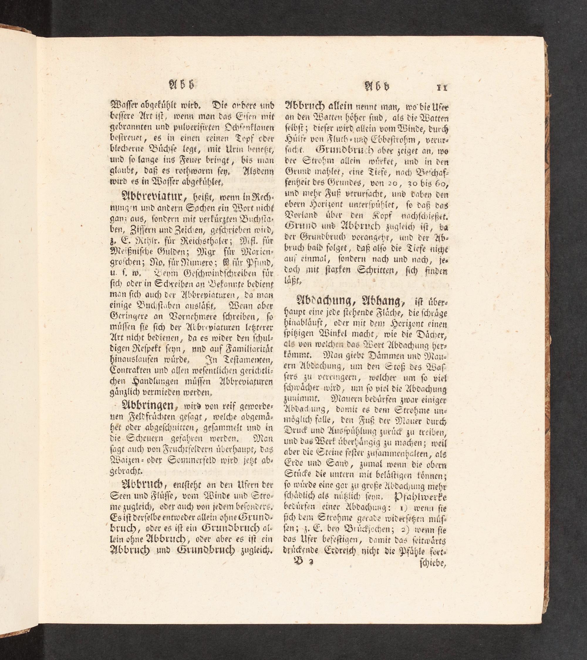 Abdachung, Abhang, iſt über. Haupt eine jede ſtehende Fläche, die ſchräge hinabläuft, oder mit den Horizont einen ſpißigen Winfel macht, wie die Dächer, ais von weichen das Wort Abdachung her» tömmt. Man giebt Dämmen und Mait- ern Abdachung, um den Stoß des Waſ- fers zu verringern, welcher um ſo viel ſchwächer wird, um ſo viel die Abdachung zuzimmt, Mauern bedürfen zwar einiger Abdachung, damit es dem Strehme un- möglich falle, den Fuß der Mauer durch Druck und Ausſpühlung zurück zu treiben, und das Werk überhängig zu machen; weil aber die Steine feſter zuſammenhalten, als Erde und Sand, zumal wenn die obern Stücke die untern mit beläſtigen könnens ſo würde eine gar zu große Abdachung mehr ſchädlich als nüßlich ſeya, Pfahlwerke vebürfen einer Abdachung: 1) wenn ſie ſic) bem Stroßme gerade widerſeßen müſ- ſen; 3. CE. bey Brückjochen; 2) wenn ſie das Ufer befeſtigen, damit das ſeitwärts drückende Credreich nicht die Pfähle Fort»