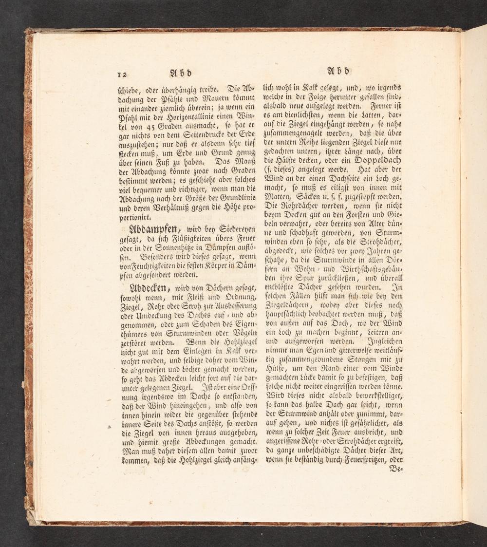 Abdecken; wird vön Dächern geſagt, ſowohl wenn, mit Fleiß und Ordnung, Ziegel, Rohr oder Stroh zur Ausbeſſerung oder Umdecung des Daches auf- und ab- genommen, oder zum Schaden des Cigen- thümers von Sturnwinden öder Vögeln zerſtöret werden: Wenn die Hoblziegel nicht gut mit dem Einlegen in Kalt ver- wahrt worden, und ſelbige däher vom Witi- de abgewörſen und Löcher gemacht werxven, fo geht das Abde>en leicht fort auf die dar- unter gelegenen Ziegel, Jſtaver eine Deſſ- nung irgendswo in) Dache ſo entſtanden, daß der Wind hineingehen, und alſo von innen hinein wider die gegenüber ſtehende innere Seite des Dachs anſtößt, ſo werden die Ziegel von innen heraus äusgehoben, und: hiemit große Abde>ungen gemacht. Man muß daher dieſem ällen damit zuvor kommen, daß die Hohlziegel gleich anfäng: