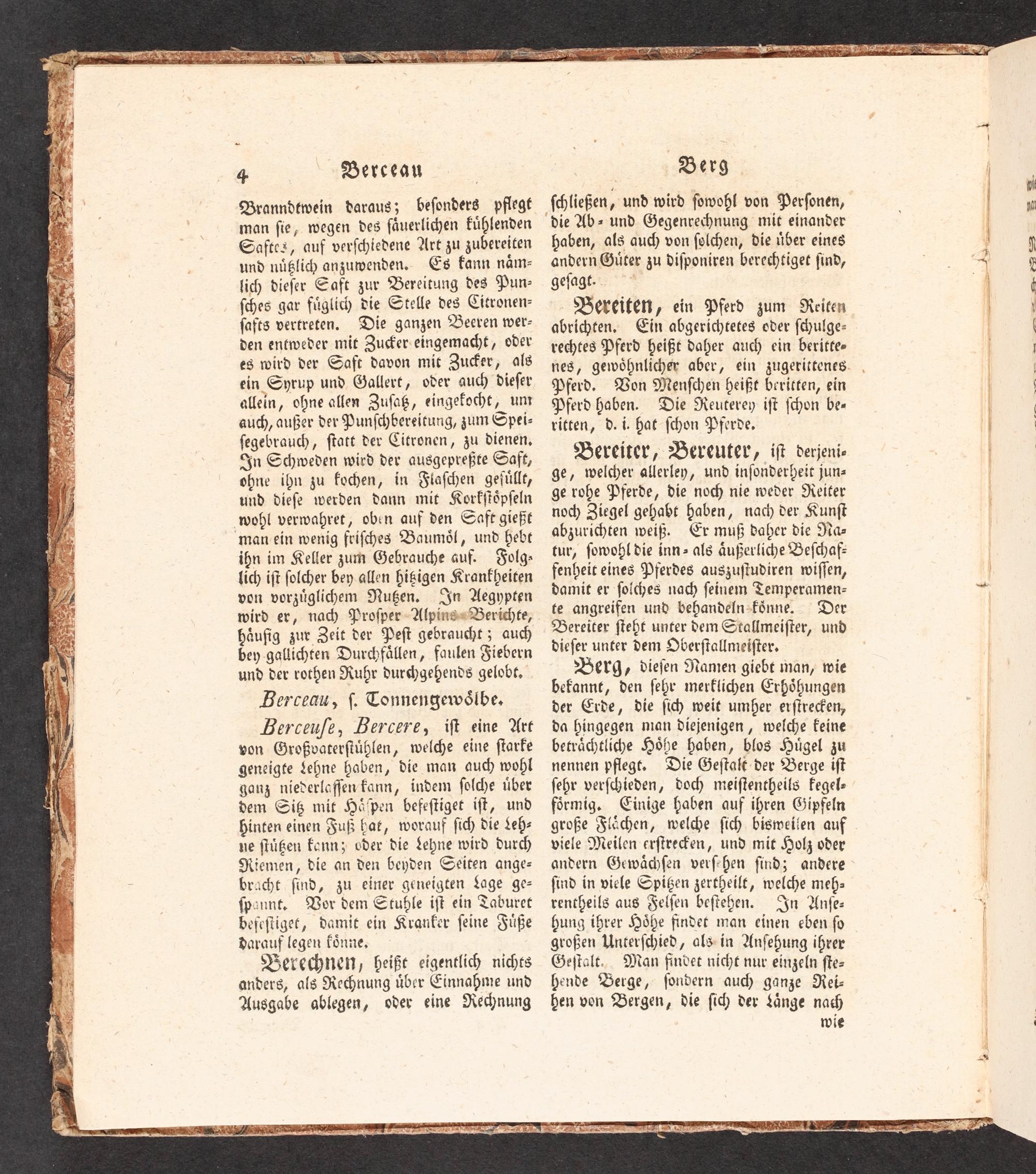 Berceuſe, Bercere, iſt eine Art von Großvaterſtühlen, welche eine ſtarke geneigte Lehne haben, die man auch wohl ganz niederlaſſen kann, indem ſolche über dem Siß mit Hä'pen befeſtiget iſt, und hinten einen Fuß bat, worauf ſich die Leh- ne ſtüßen konn; oder die Lehne wird durch Riemen, die an den beyden Seiten ange- bracht ſind, zu einer geneigten Lage ge- ſpannt, Vor dem Stuhle iſt ein Taburet befeſtiget, damit ein Kranker ſeine Füße darauf legen könne,