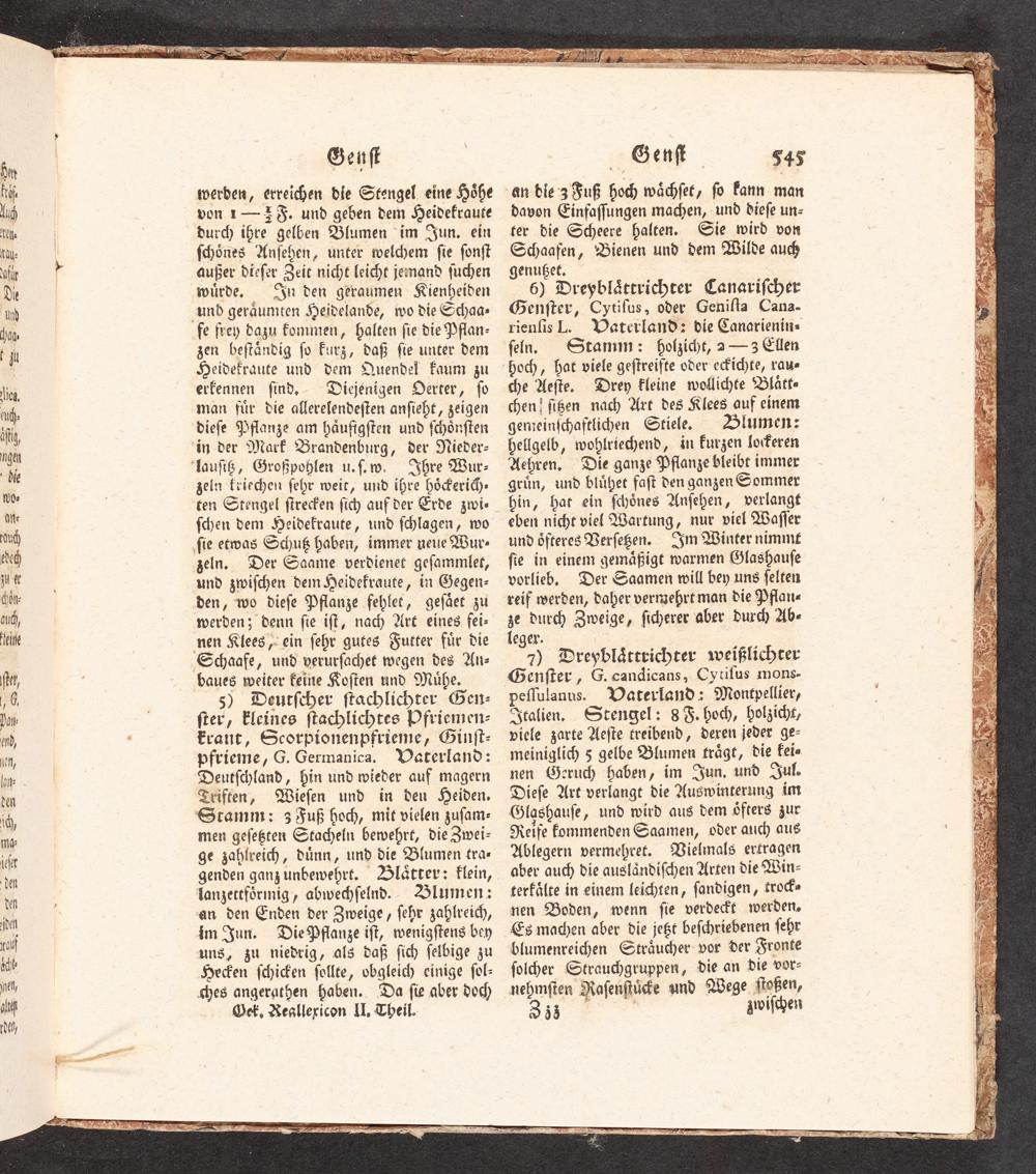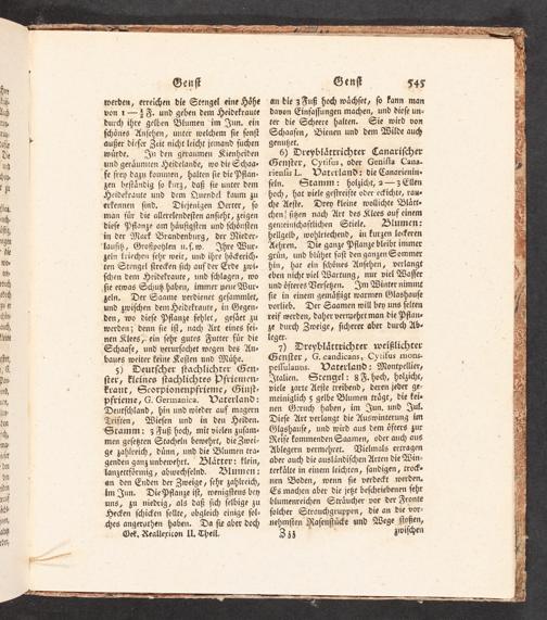 6) Dreyblättrichter Canariſcher Genſter, Cytiſus, oder Geniſta Cana- rienlis L. Vaterland: die Canarienin« ſeln. Stamm: holzicht, 2--3 Ellen hoch, hat viele geſtreifte oder ecichte, raue <e Aeſte. Drey kleine wollichte Blätt« <en! ſißen nach Art des Klees auf einem gemeinſchaftlichen Stiele. HFHlumen: hellgelb, wohlriechend, in kurzen lockeren Aehren. Die ganze Pflanze bleibt immer grün, und blühet faſt den ganzen Sommer hin, hat ein ſchönes Anſehen, verlangt eben nicht viel Wartung, nur viel Waſſer und öfteres Verſeßen- Jm Winter nimmt ſie in einem gemäßigt warmen Glashauſe vorlieb, Der Saamen will bey uns ſelten reif werden, daher vernzehrt man die Pflan- ze durch Zweige, ſicherer aber durch Ab- leger.