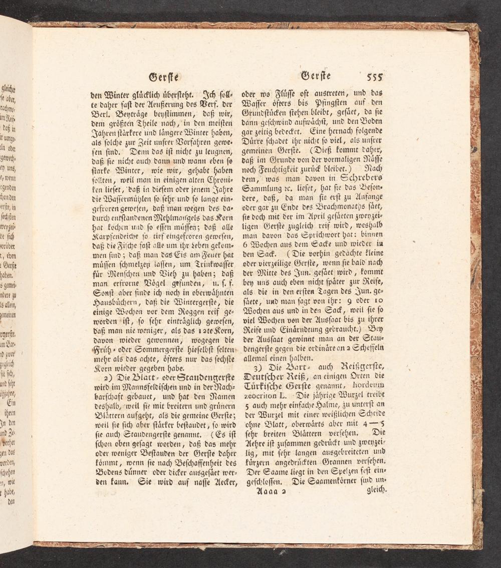 oder wo Flüſſe oft austreten, und das Waſſer öfters bis Pfingſten auf. den Grundſtücken ſtehen bleibt, geſäet, da ſie dänn geſchwind aufwächſt, und den Boden gar zeitig bedecket. Cine hernach folgende Dürre ſchadet ihr nicht ſo viel, als unſrer gemeinen Gerſte.(Dieß kommt daher, daß int Grunde von der vormaligen Näſſe noch Feuchtigkeit zurück bleibet.) Mach dem, was man davon in Schrebers Sammlung?c. lieſet, hat ſie das Beſon- dere, daß, da man ſie erſt zu Anfange oder gar zu Ende des Brachmonatys ſäet, ſie doch mit der im April geſäaeten zweyzei- ligen Gerſte zugleich reif wird, weshalb man davon das Sprichwort hat: binnen 6 Wochen aus dem Sacke und wieder iu den Sack.(Die vorhin gedächte kleine oder vierzeilige Gerſte, wenn ſie baid nach der Mitte des Jun. geſäet wird, komme bey uns auch eben nicht ſpäter zur Reife, als die in den erſten Tagen des Jun. ge- ſaete, uad man ſagt von ihr: 9 oder 10 Wochen aus und in den Sack, weil ſie ſo viel Wochen von der Ausſaat bis zu ihrer Reife und Einärndtung gebraucht.) Bey der Ausſaat gewinat man an der Stau- dengerſte gegen die ordinarean 3 Scheſſeln allemal einen halben.
