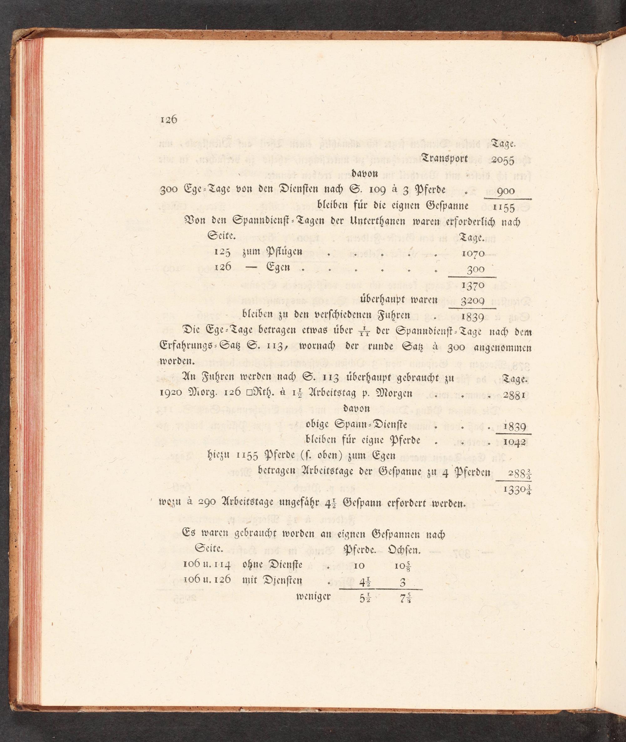 Transport 2055 davon: 300 BE Ze von den Dienſten nam S. 109 a 3 Pferde„. 900 bleiben für die eignen Geſpanne 1155 Von den Spanndienſt- Tagen der Unterthanen waren erforderlich nach