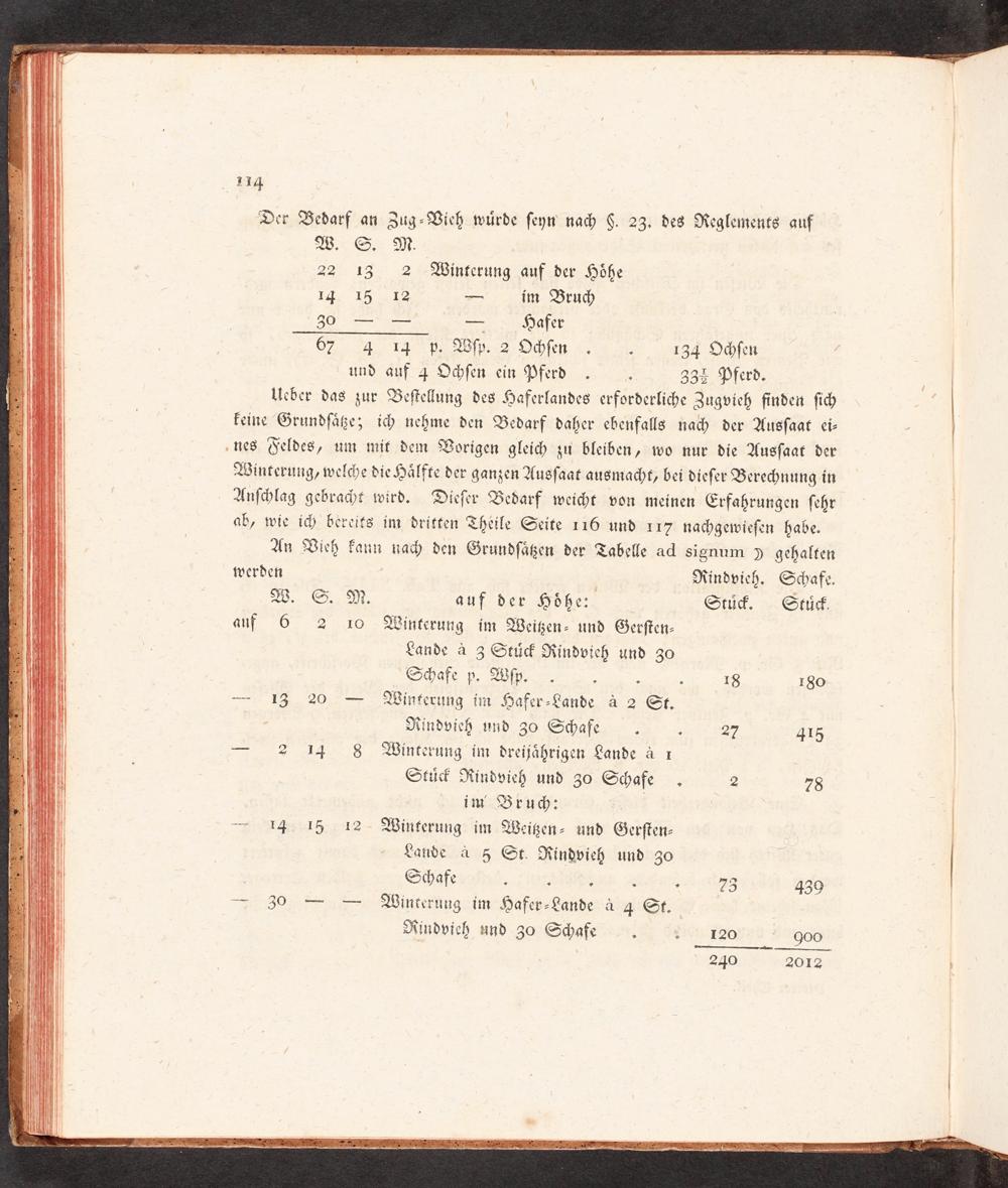 Ueber das zur Beſtellung des Haferlandes erforderliche Zugvieh finden ſich keine Grundſaͤtze; ich nehme den Bedarf daher ebenfalls nach der Ausſaat ei⸗ nes Feldes, um mit dem Vorigen gleich zu bleiben, wo nur die Ausſaat der Winterung, welche die Haͤlfte der ganzen Ausſaat ausmacht, bei dieſer Berechnung in Anſchlag gebracht wird. Dieſer Bedarf weicht von meinen Erfahrungen ſehr ab, wie ich bereits im dritten Theile Seite 116 und 117 nachgewieſen habe.