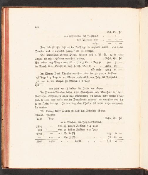 Die ſaͤmmtlichen Spann-Dienſte beſtehen nach 3. Th. S. 124 in 3209 Tagen, die mit 3 Pferden verrichtet werden. Rthrl. Gr. Pf. Sie waͤren angeſchlagen nach S. 119 à 3 Gr. p. Tag zu 401 3— der Werth dieſer Dienſte iſt nach 3. Th. S. 128. 4285 18—
