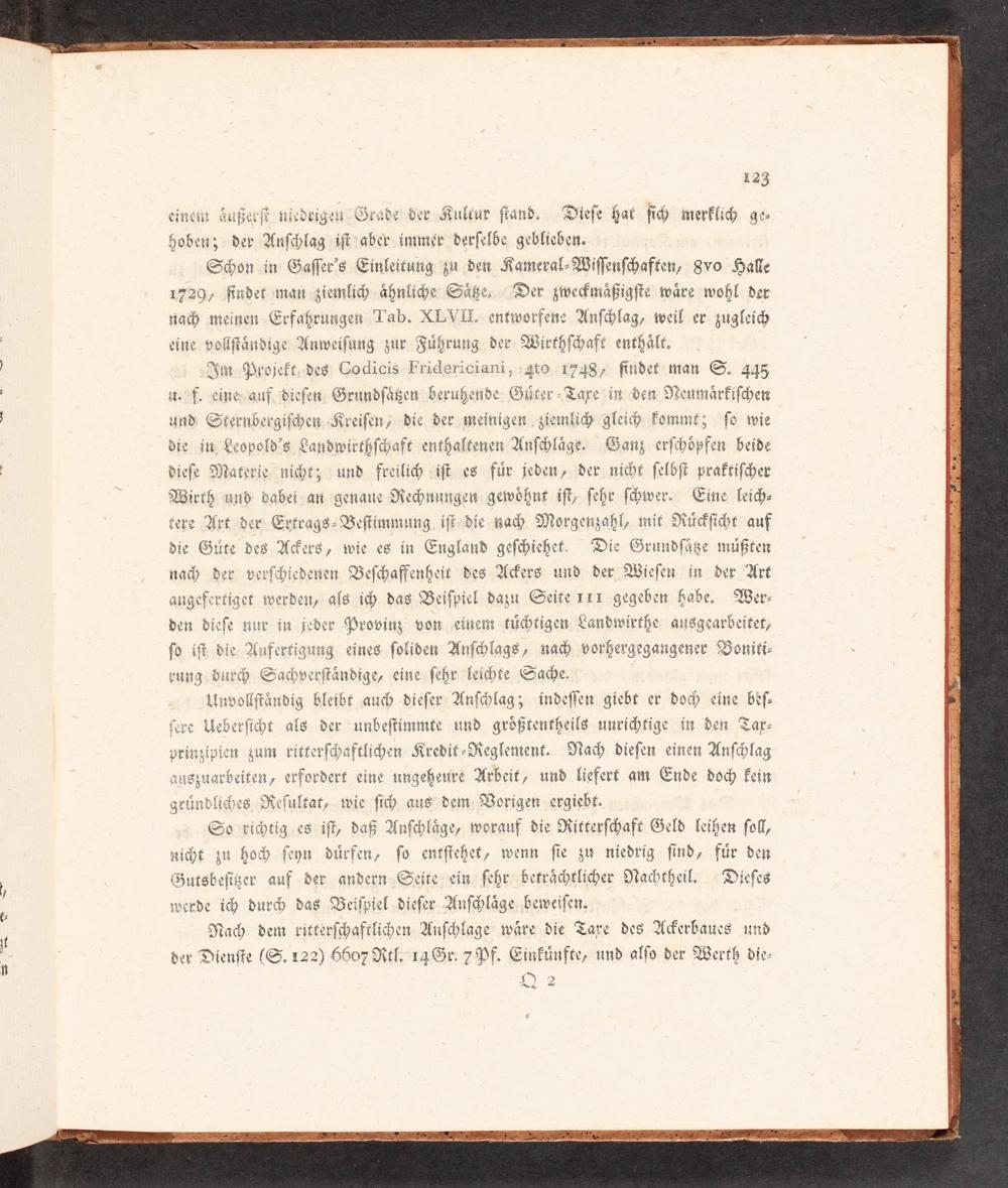 einein äußerſt niedrigen Grade der Kultur ſtand. Dieſe hat fi merklich ge- hoben; der Anſchlag iſt" aber immer derſelbe MED Schon in Gaſſer's Einleitung zu den Kameral- Wiſſenſchaften, 8vo Halle 1729, findet man ziemlich ähnliche Säße, Der zwemäßigſte wäre wohl der nach meinen Erfahrungen Tab. XVII. entworfen? Anſchlag, weil er zugleich eine velſtädige Anweiſung zur Führung 3 der- Wirthſc<haft enthält. Im. Projekt,.des Codicis Fridericiam,:4to 1748, findet man S. 445 a. Ff. eine auf. dieſen: Grundſäßen WDE Güter- Taxe:in den Neumärkiſchen und; Sternbergiſchen- Kreiſen/ die der meinigen ziemlim glei. komm?» ſo wie die in: Leopold's Landwirthſchaft enthaltenen Anſ<läge. Ganz erſchöpfen beide dieſe Materie. ni<tz3 und freilich iſt es für jeden, der nicht ſelbſt praktiſcher Wirth und dabei an genaue Rechnungen gewöhnt iſt, ſehr ſHwer. Eine leich- tere Art der Ertrags- Beſtimmung iſt..die yam Morgenzahl, mit Rückſicht auf die Güte des A>ers, wie es in England geſchiehet. Die Grundſätze mußten nach der verſchiedenen Beſchaffenheit des Ackers und der Wieſen in der Art angefertiget werden, als im das Beiſpiel dazu Seite 11x gegeben habe, Wer- den dieſe nur in jeder Provinz von einem tüchtigen Landwirthe ausgearbeitet, ſo it die Anfertigung eines ſoliden Anſchlags, Kac< vorhergegangener Voniti- pvung dur Sachverſtändige, eine ſehr leichte Sache. Unvollſtändig bleibt auch dieſer Anſchlag 3 indeſſen giebt er doh eine beſ- | Ueberſiht als der unbeſtimmte und größtentheils unrichtige in den Tax- nzipien zum ritterſchaftlihen Kredit-Reglement. Nah dieſen einen Anſchlag yszuarbeiten, erfordert eine ungeheure Arbeit, und liefert am Ende doch kein zründlid Jes Reſultat, wie ſich aus dem Vorigen ergiebt. 0 richtig es iſt, daß Anſchläge, worauf die Ritterſchaft Geld leihen ſoll, nicht zu hoh ſeyn dürfen, ſo entſtehet, wenn ſie zu niedrig ſind, für den Zutsbeſiger auf der andern Seite ein ſchr: beträchtliher Nachtheil, Dieſes werde iG dur< das Beiſpiel dieſer Anſchläge beweiſen. Nach dem ritterſ<haftlihen Anſchlage wäre die Taxe des Aerbaucs und der Dienſte(S. 122) 6607 Rtl. 14 Gr. 7 Pf. Einkünfte, und alſo der Werth die-