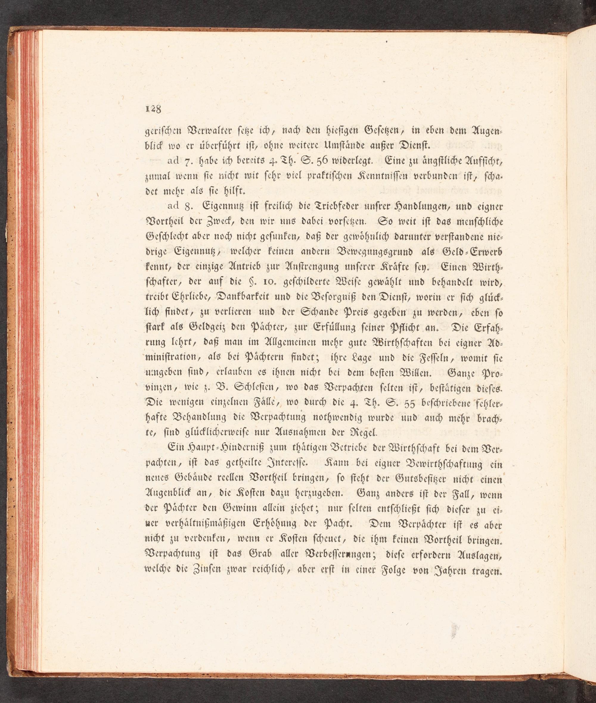 ad 8. Eigennug iſt freilich) die Triebfeder unſrer Handlungen, und eigner Vortheil der Zweck, den wir uns dabei vorſcken. So weit iſt das menſchliche Geſchlecht aber noFH nicht geſunfen, daß der gewöhnlich) darunter verſtandene nie- drige Eigennuß, welcher keinen andern Bewegungs8grund als Geld- Erwerb kennt, der einzige Ankrieb zur Anſtrengung unſerer Kräfte ſey. Einen Wirth- ſchafter, der auf die 5. 10. geſchilderte Weiſe gewählt und behandelt wird, treibt Ehrliebe, Dankbarkeit und die Beſorgniß den Dienſt, worin er ſich glück- lim findet, zu verlieren und der Schande Preis gegeben zu werden, eben ſo ſtark als Geldgeiz den Pächter, zur Erfüllung ſeiner Pfliht an. Die Erfah- rung lchrt, daß man im Allgemeinen mehr gute Wirthſchaften bei eigner Ad-