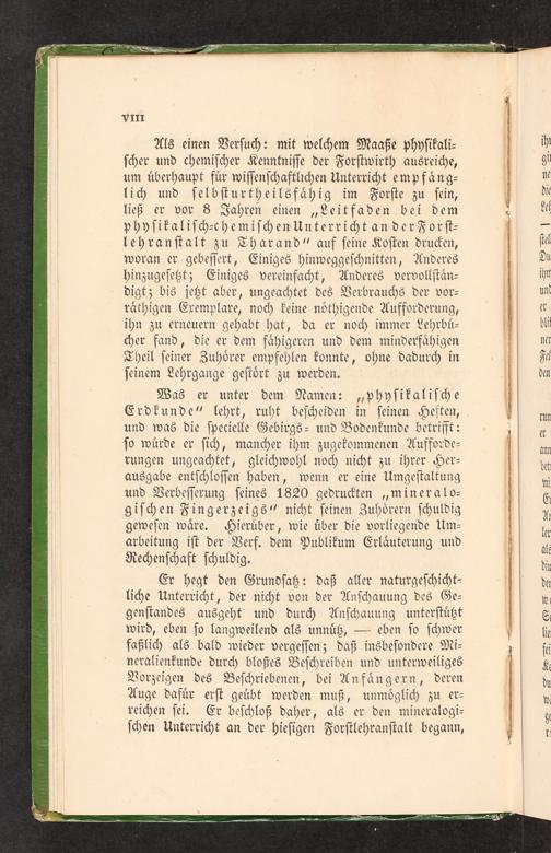 Als einen Verſuch: mit welchem Maaße phyſikali⸗ ſcher und chemiſcher Kenntniſſe der Forſtwirth ausreiche, um uͤberhaupt fuͤr wiſſenſchaftlichen Unterricht empfaͤng⸗ lich und ſelbſturtheilsfaͤhig im Forſte zu ſein, ließ er vor 8 Jahren einen„Leitfaden bei dem phyſikaliſch-chemiſchen Unterricht an der Forſt⸗ lehranſtalt zu Tharand“ auf ſeine Koſten drucken, woran er gebeſſert, Einiges hinweggeſchnitten, Anderes hinzugeſetzt; Einiges vereinfacht, Anderes vervollſtaͤn⸗ digt; bis jetzt aber, ungeachtet des Verbrauchs der vor⸗ raͤthigen Exemplare, noch keine noͤthigende Aufforderung, ihn zu erneuern gehabt hat, da er noch immer Lehrbuͤ⸗ cher fand, die er dem faͤhigeren und dem minderfaͤhigen Theil ſeiner Zuhoͤrer empfehlen konnte, ohne dadurch in ſeinem Lehrgange geſtoͤrt zu werden.