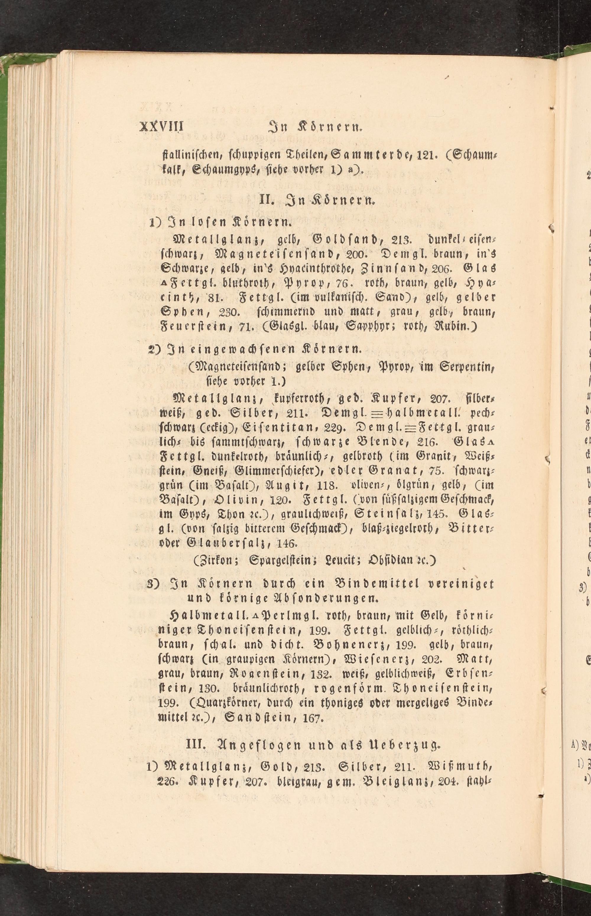 | Metallglanz, kupferroth,; ged. Kupfer, 207. ſilber- ih weiß; ged. Silber, 211. Demgl.=Hhalbmetall: pech- ſchwarz Cecfig), Eiſentitan,- 229. Demgl.=Fettgl. grau- | lichs bis ſammtſchwarz; ſchwarze Blende, 216. Glasa Fettgl. dunkelroth, bräunlich-( im Granit Weißs- ſtein» Gneiß; Glimmerſchiefer), edler Granat, 75. ſchwarz- grün Cim- Baſalt), Augit, 118. vliven-, dlgrün, gelb, Cim Baſalt), Olivin, 120- Fettgl.(von ſüßſalzigem Geſchmack, im Gyps8, Thon 2c.), graulichweiß, Steinſalz, 145. Glas- gl.(won ſalzig bitterem Geſchma>), blaß-ziegelrorh; Bitter-