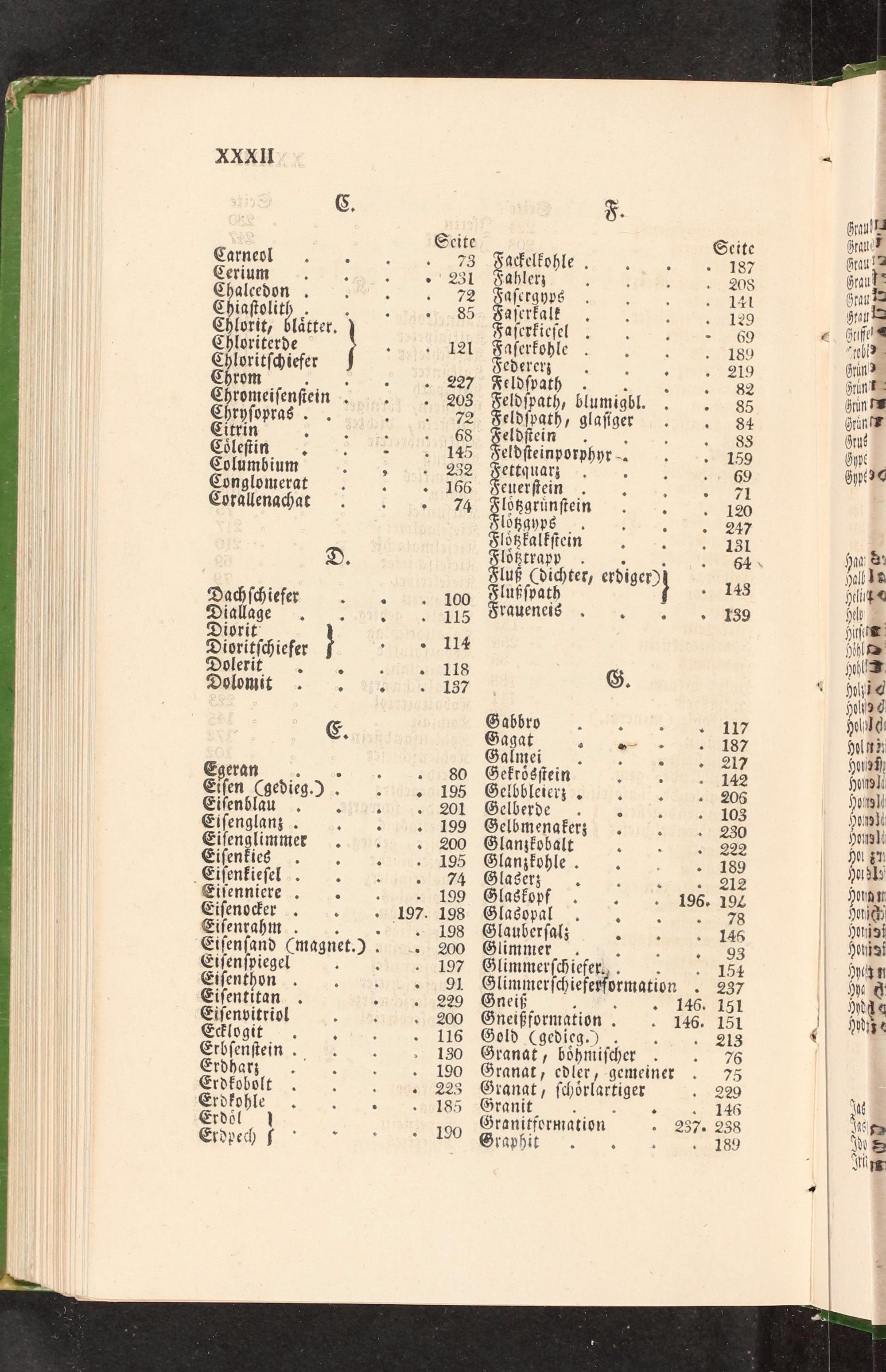 Carneol Cerium: Chalcedon. Chiaſtolitl Chlorit, lätter. Chloriterde Chloritſchiefer Chrom:; Chromeiſenſiein. Chryſopras. Citrin 5 Coleſtin., Columbium Conglomerat Corallengchat