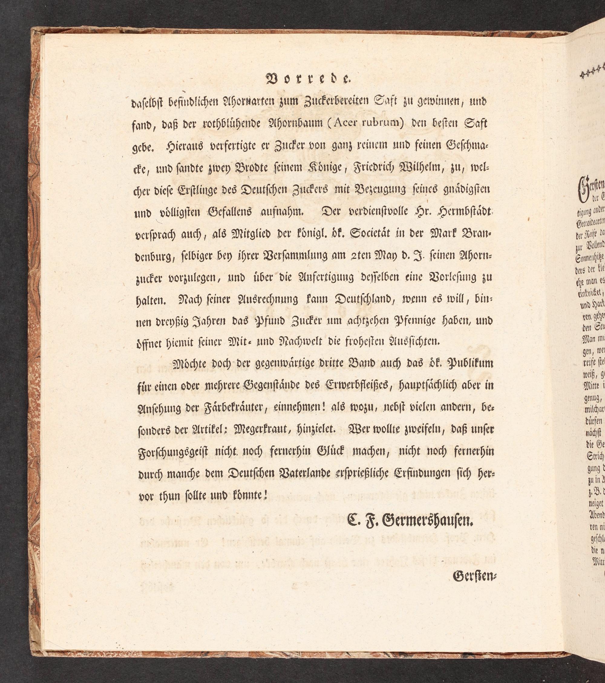 denburg, ſelbiger bey ihrer Verſammlung am 2ten May d. IJ. ſeinen Ahorn- zucker vorzulegen, und über die Anfertigung deyſelben eine Vorleſung zu halten, Nach ſeiner Ausrechnung kann Deutſchland, wenn es will, bin: nen dreyßig Jahren das Pfund Zucker um achtzehen Pfennige Haben, und öffnet hiemit ſeiner Mit- und Nachwelt die froheſten Ausſichten,