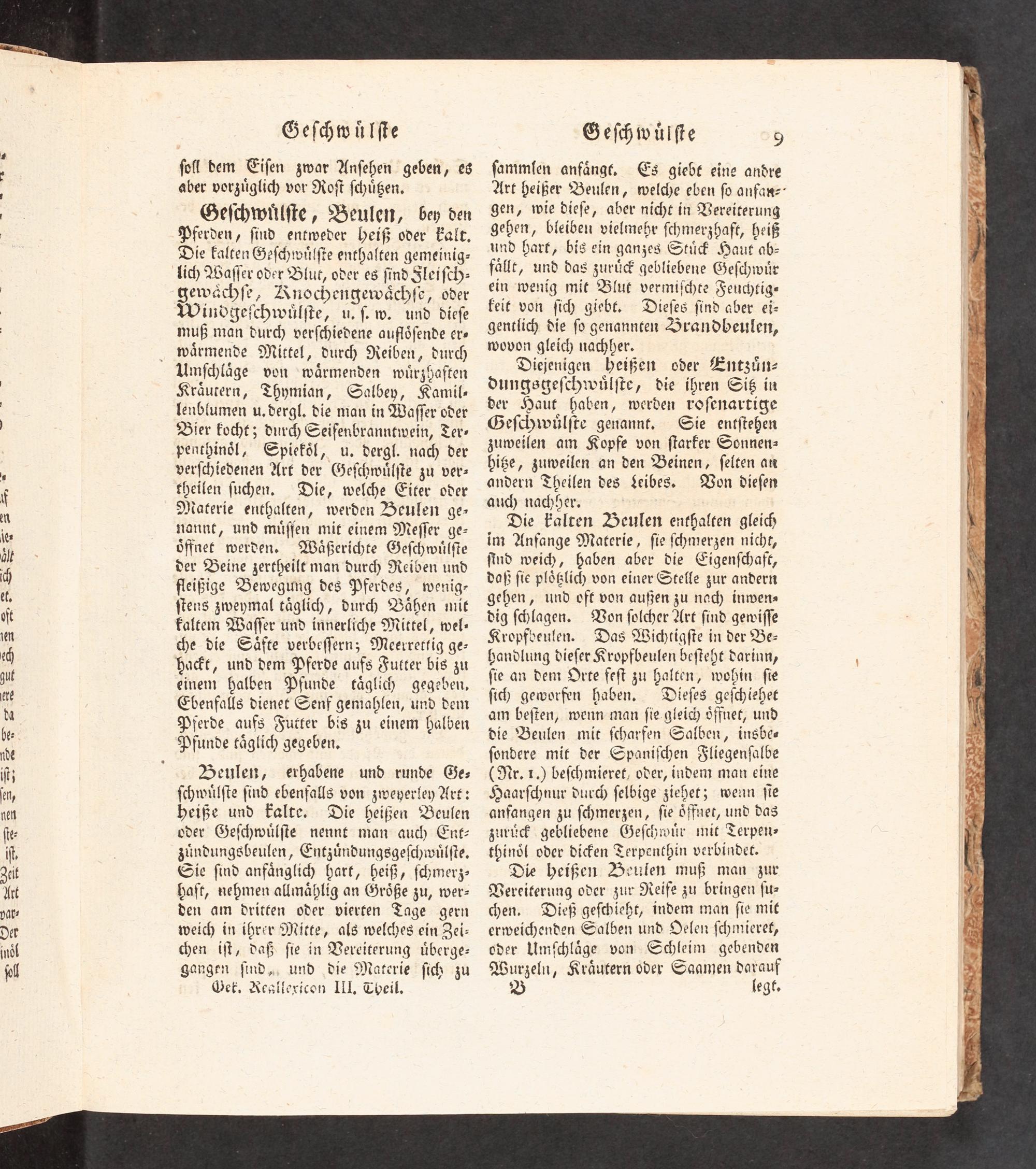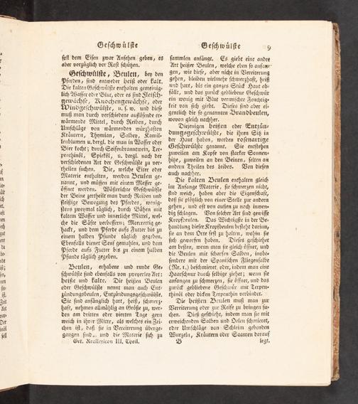 ſoll dem VEiſen zwar Anſehen geben, es aber vorzüglich vor Ro ſchüßen, Geſchwülſte, Beulen, bey den Pferden, ſind entweder heiß oder kalt, Die kalten Geſchwülſte enthalten gemeinig-