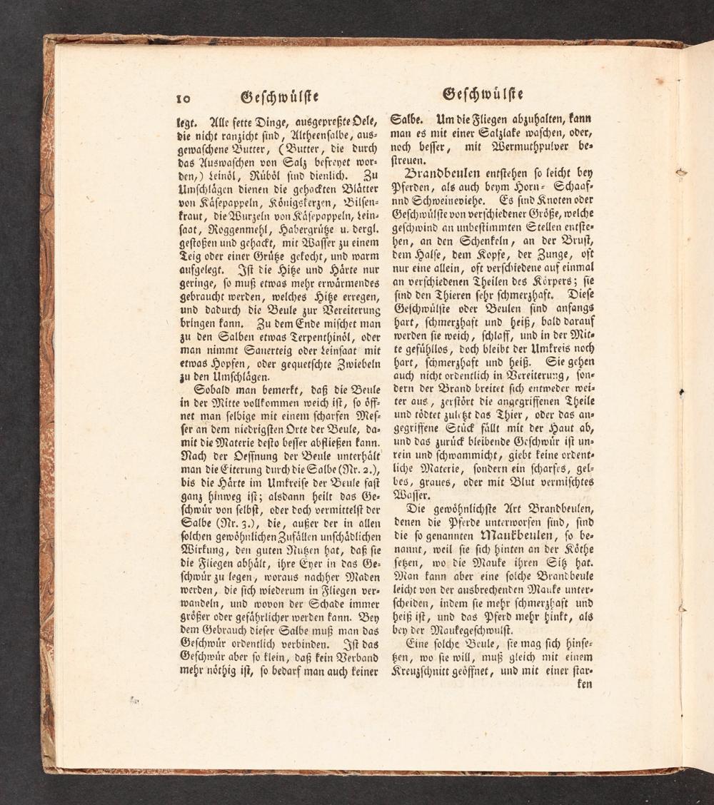 Zrandbeulen entſtehen ſo leicht bey Pferden, als auch beym Horn- Schaaf- nnd Schweineviehe, Cs ſind Knoten oder Geſchwülſte von verſchiedener Größe, welche geſchwind an unbeſtimmten Stellen entſte» hen, an den Schenkeln, an der Bruſt, dem Halſe, dem Kopfe, der Zunge, oft nur eine allein, oft verſchiedene auf einmal an verſchiedenen Theilen des Körpers z; ſie ſind den Thieren ſehr ſchmerzhaft, Dieſe Geſchwülſte oder Beulen ſind anfangs hart, ſchmerzhaft und heiß, bald darauf werden ſie weich, ſchlaff, und in der Mito te gefühllos, doch bleibt der Umkreis noch hart, ſchmerzhaft und heiß. Site gehen auch nicht ordentlich in Vereiterung, ſon- dern der Brand breitet ſich entweder wei- ter aus, zerſtört die angegriffenen Theile und rtödtet zulcßt das Thier, oder das an» gegriffene Stück fallt mit der Haut ab, und das zurück bleibende Geſchwür iſt un» rein und ſ<wammicht, giebt keine ordenk- liche Materie, ſondern ein ſcharfes, gel- bes, graues, oder mit Blut vermiſchtes Waſſer.