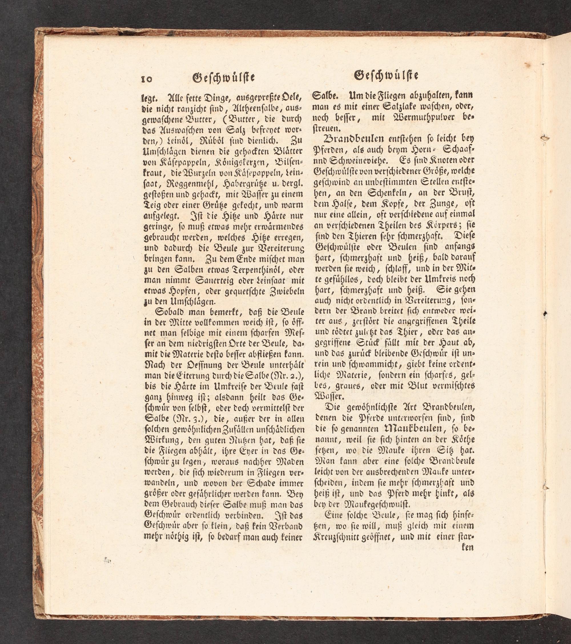 Die gewöhnlichſte Art Brandbeulen, denen die Pferde unterworfen ſind, ſind die ſo genannten UÜJaukbetilen, ſo be- nannt, weil ſie ſich hinten an der Köthe ſeßen, wo die Mauke ihren Siß hat. Man kann aber eine ſolm<e Brandbeule leicht von der ausbrechenden Mauke unter- ſcheiden, indem ſie mehr ſchmerzbaft und heiß iſt, und das Pferd mehr hinft, als bey der Maukegeſchwuiſt.