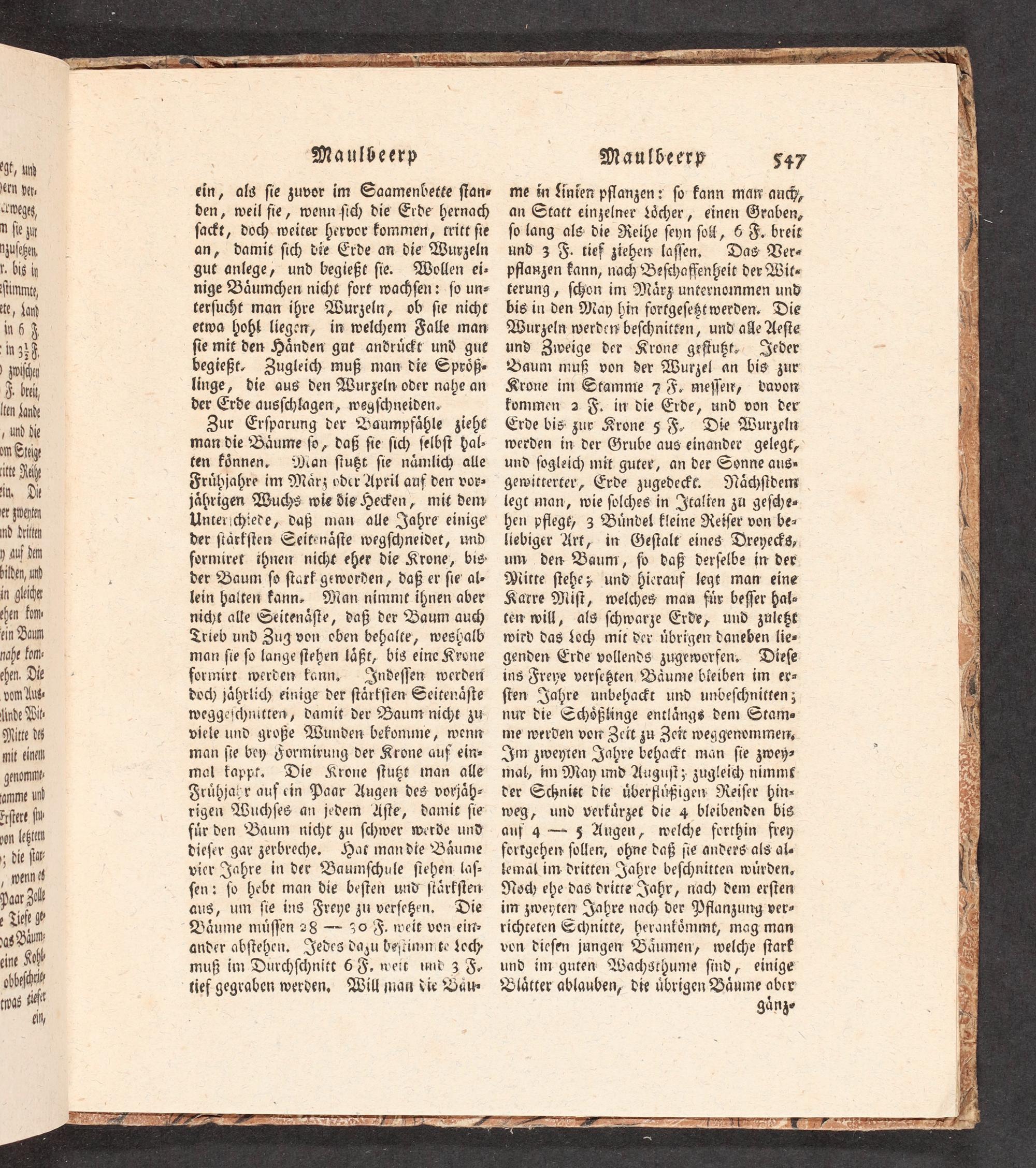 me in Linien pflanzen* ſo kann mar auch, an Statt einzelner Löcher, einen Graben, ſo lang als: die Reihe ſeyn ſo8t, 6 F. breit und 3 F. tief zieherz laſſen, Das Ver« pflanzen kann, nach Beſchaffenheit der Wit« terung, ſchon im März unternommen und bis in den May hin fortgeſeßt werden. Die Wurzeln werden beſchnitten, und ale Aeſte und Zweige der Krone geftußt.. Jeder Baum muß von der Wurzel an bis zur Krone im Stamme 7 F. meſſewr, vavon kommen 2 F. in die Erde, und von der Erde bis zur Krone 5 F- Die Wurzeln werden in der Grube aus einander gelegt, und ſogleich mit guter, an der Sonne aus» gewitterker, Erde zugede>t. Nächſidem legt man, wie ſolches in Jtalien zu geſches- hen pflege; 3 Bündel kleine Reiſer von be- liebiger Art, in Geſtalt eines Dreyecs,. um den Baum, ſo daß derſelbe in der Mitte ſtehez35 und hierauf legt man eine Karre Miſt, welches mana für beſſer hals ter will, als ſchwarze Erde, und zuleßt wird das Loc< mit der übrigen daneben lie- genden Erde vollends zugeworfen. Dieſe ins Freye verſeßten Bäume bieiben im er- ſten Jahre unbehact und unbeſchnitten z nur die Schsßlinge entlängs dem Stame me werden von Zeit zu Zeit weggenommen; Im zweyten Jahre behackt man ſie zwey» mat, im May und Auguſt 3 zugleich nimmt der Schniet die überfiüßigen Reiſer hin= weg, und verkürzet die 4 bleibenden bis auf 4== 5 Augen, welche forthin frey fortgehen ſollen, ohne daß ſie anders als als temal im dritten Jahre beſchnitten würden, Nod) ehe das dritte Jahr, nac dem erſten im zweyten Jahre noch der Pflanzung ver- richteten Schnitte, heranfömmt, mag man von dieſen jungen Bäumen, welche ſtark und im guten Wachsthume ſind, einige Blätter ablauben, die übrigen Bäume abcr gänze