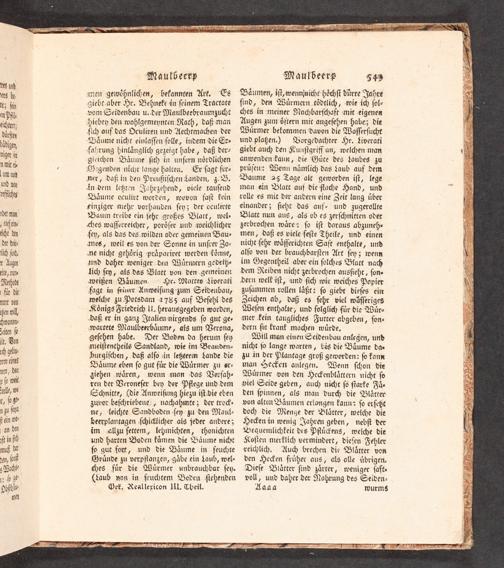 "Bäumen, iſt,wenninithe' höchſt dürre Jahre ſind, den Würmern.tödtlich,-wie ich ſol- dyes in meiner Nachbarſchaft mit-eigenen Augen zum öftern mit angeſehen habe; die Würmer bekommen:davon die Waſſerſucht und plaßen.) Worgedachter Hr. Liverati giebt auch den Kunſtgriff an, welchen-man anwenden kann, die Güte des Laubes zu prüfen: Wenn nämlich das Laub auf dem Baume 25 Tage alt geworden iſt, lege man ein Blatt auf die flache Hand, und xolle es mit der andern eine Zeit lang über einander 3 ſieht das auf- und zugerollte Blatt nun aus,.als ob es zerſchnitten oder zerbrochen wäre: ſo iſt daraus abzuneh- men, daß es viele feſte Theile, und einen nicht ſehr wäſſerichten Saft enthalte, und alſo von der brauchbarſten Art ſey 3; wenn im Gegentheil aber ein ſol<hes Blatt nach dem Reiben nicht zerbrochen ausfieht, ſon» dern welk iſt, und ſich wie weiches Popier zuſammen rollen läßt: ſo giebt dieſes einn Zeichen ab, daß es ſehr viel wäſſeriges Weſen enthalte; und folglich für die Wür- mer fein taugliches Futter abgeben, ſon- dern ſie trank machen würde,