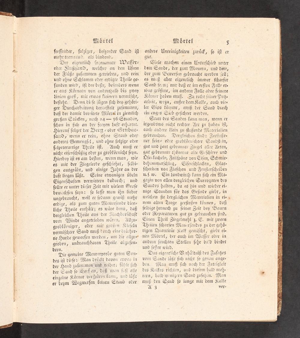 Der eigentlich Hzenannte Waſſer- over SE welcher an den Ufern der Fiuüße zuſammen getrieben, und rein und aÖbe Schlamm oder erdigre Theile ge- funden wird, iſt der beſte, beſonders'wenn er aus Körnern von anderthalb bis zdey finien groß, mit etwas fieinern vermiſcht, beſteht. Denn dieſe fügen ſich bey geböri- ger Durcharbeitung dergeſtalt zuſammnten, daß der damit bereitete Mörtel in ziemlich großen Stücken/ nach 24== 36 Stunden, ſchon in ſich an der freyen Lute erhärtet. Hierauf folget der Zerg- oder Grudei- ſaid, wenn ex rein, ohne Staub oder anderes Gemengſel, und ohne falzige odev ſalpeterartige Theile iſt, Au) muß er nicht eiſenſchüßig oder zu grobkörnicht ſeyn. Hierbey iſt es am beſten, wenn man, wie es mit der Ziegelerde geſchiehet, ſelbi- gen ausgräbt, und einige Jahre an der Luft liegen läßt. Geine etwanigen übeln Eigenſchaften verwittern dadurd); und ſollte er unter dieſer Zeit mit vielem Gyraſe bewachſen 7 ſo laſſe man ihn lieber ungebraucht, Zi er ſodann gewiß mehr erdige, als zum guten Moauerfande dien- 16 Theile enthält; es wäre denü, daß dergleichen Theile aus'der viachborſchaft vom Winde angetrieben wären. AÄllzu- grobförniger, oder mit größen Kieſeln vermiſchter Sand muß dur eine vrächer- ne Hurde geworfen werden ,/ um die allzu=" groben, unbrauchbaren Theile. abzuſon« dern,