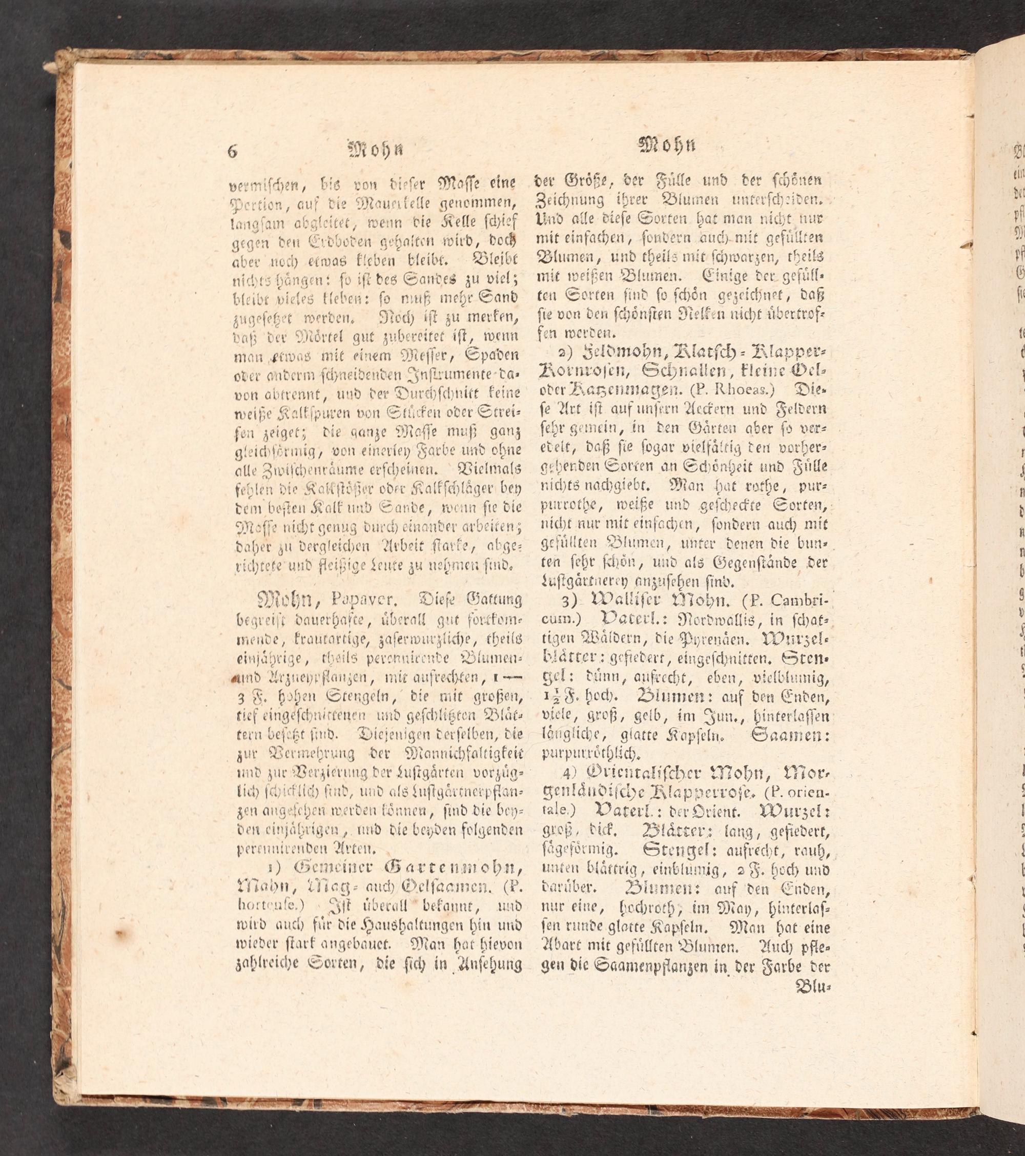 MRobn, Popaver, Dieſe Gattung i(t dauerhafte, überall gut fortkom- mende, Frautartige, zaſerwurzliche, theils einjährige, teils pevennicende Biumen- aund Aezneypflanzen, mit aufrechten, 1== 3 X. hohen Stengeln, die mit großen, tief eingeſchnittenen und geſchlißton Blät« tern beſoßt ſind. Diejenigen derſelben, die zur Vermehrung der Mannichfaltigfeit nnd zur Verzierung der WUſtgartän vorzüg» lich ſchicflid) ſind, und als Luſtgärtnerpflan- zen angeſehen werden können, ſind die bey- den einjährigen ,. und die beyden folgenden perennirenden Arten,,