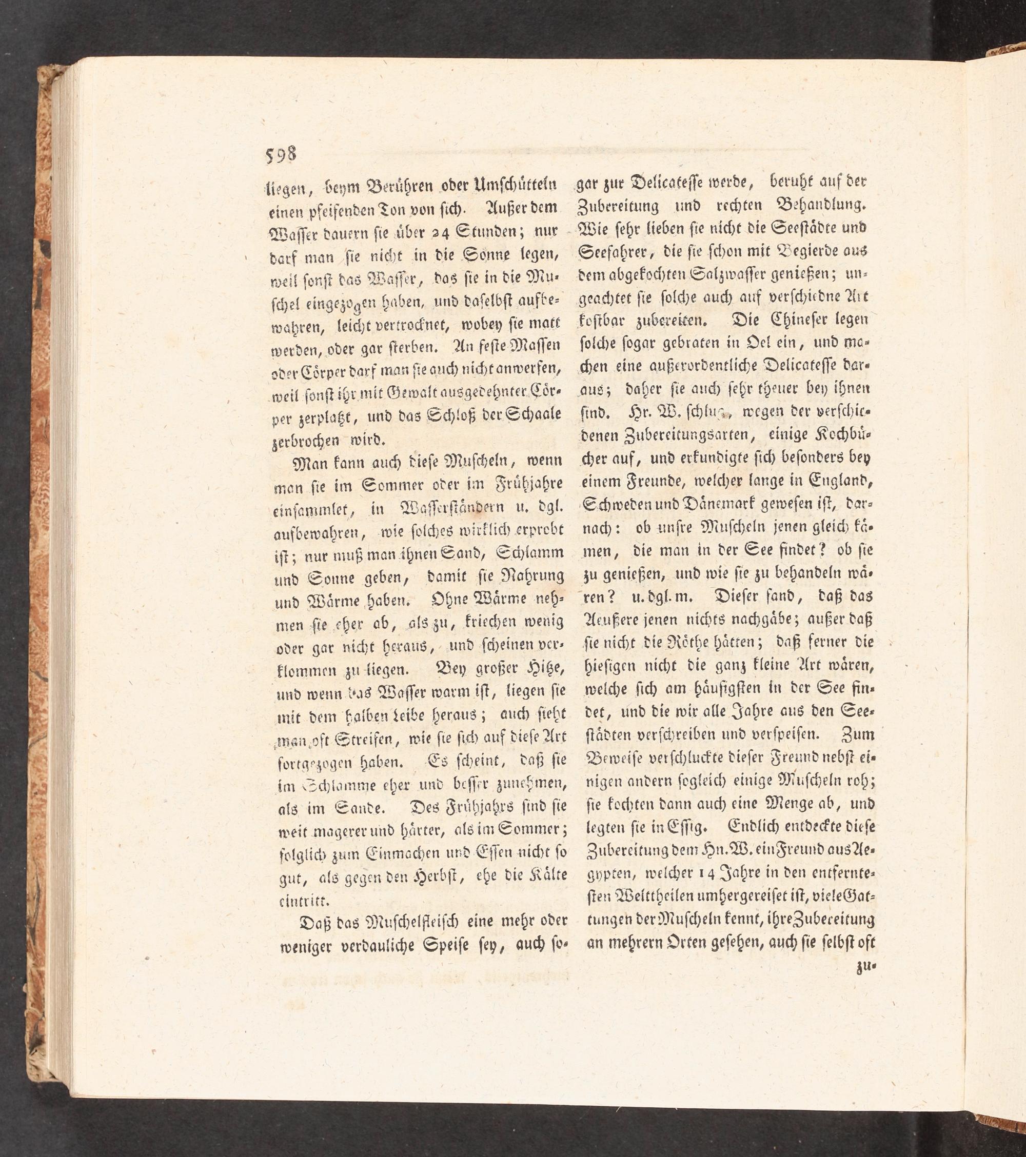 Aeußere jenen nichts nachgäbez; außer daß ſie nicht die Röthe hätten; daß ferner die hieſigen nicht die ganz kleine Art wären, welche ſich am häufigſten in der See fin- det, und die wir alle Jahre aus den See- ſtädten verſchreiben und verſpeiſen. Zum Beweiſe verſchluckte dieſer Freund nebſt ei» nigen andern ſogleich einige Muſcheln roh; ſie kochten dann auch eine Menge ab, und legten ſie in Cſſig« Endlich entdeckte dieſe Zubereitung dem Hn.W, ein Freund aus Ae- gypten, welcher 14 Jahre in den entfernte- ſten Welttheilen umhergereiſet iſt, vieleGat- tungen der Muſcheln kennt, ihreZubeceitung an mehrern Orten geſehen, auch ſie ſelbſt oft