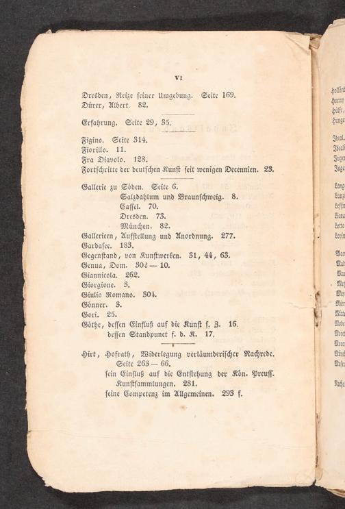 Gallerie zu Söden. Seite 6. Salzdahlum und Braunſchweig. 8, Caſſel. 70. Dresden. 73. München. 82. Gallerieen, Aufſtellung und Anordnung. 277. Gardaſee. 183. Gegenſtand, von Kunſtwerken. 31, 44, 63. Genua, Dom. 302-- 10. Giannicola. 262. Giorgione. 3. Giulio Romano. 304. Gönner. 3. Gori. 25. Göthe, deſſen Einfluß auf die Kunſt ſ. 3. 16. deſſen Standpunct f. d. K. 17. NEE IE Hirt, Hofrath, Widerlegung verläumderiſcher Narede, Seite 263-- 66, ſein Einfluß auf die Entſtehung der Kön. Preuſſ. Kunſtſammlungen, 281.