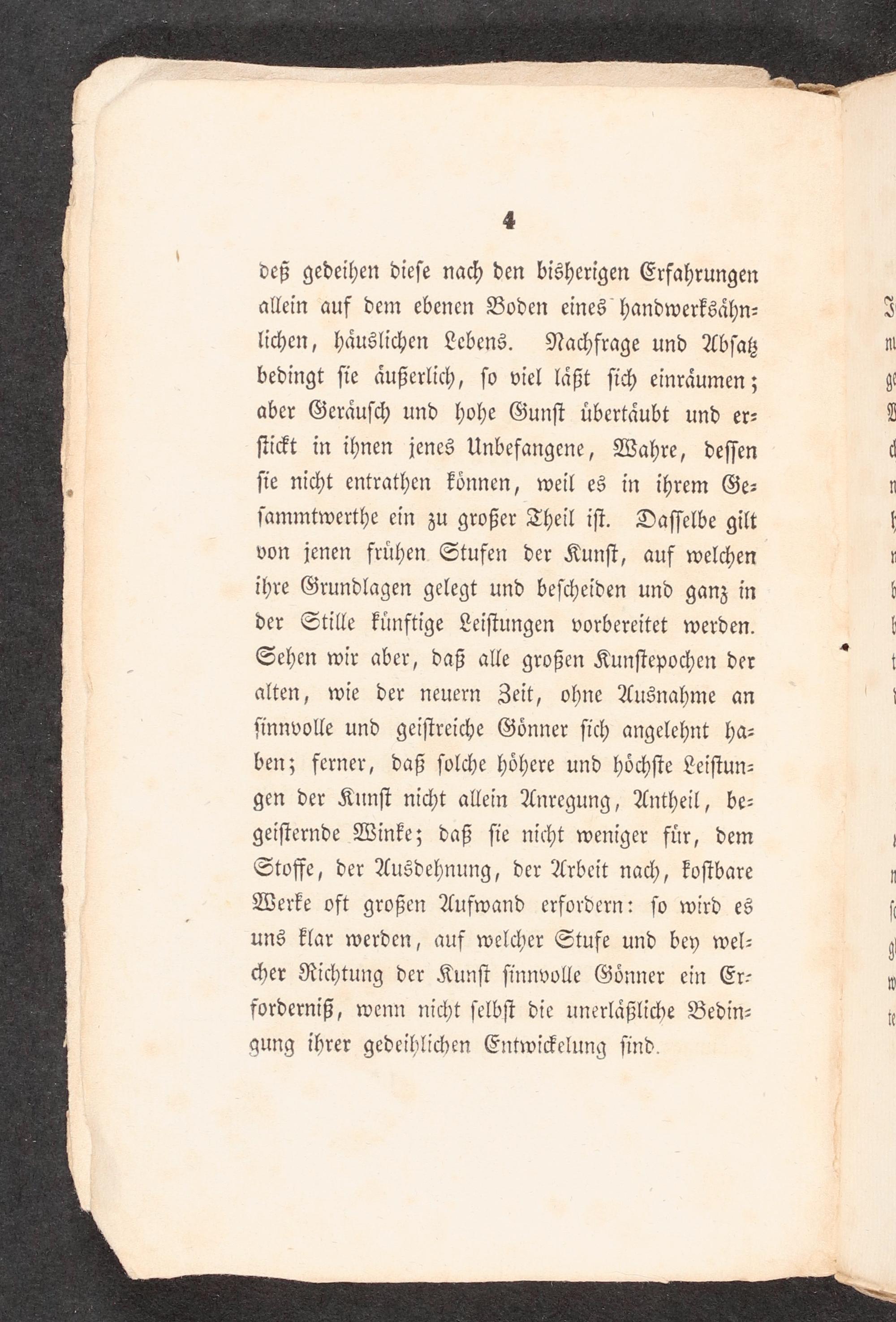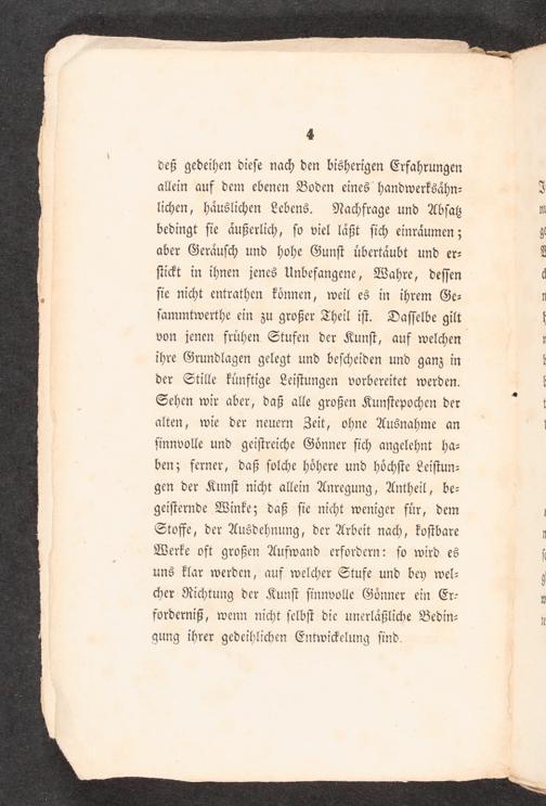 deß gedeihen dieſe nach den bisherigen Erfahrungen allein auf dem ebenen Boden eines handwerksähn- lichen, häuslichen Lebens. Nachfrage und Abſaß bedingt ſie äußerlich, ſo viel läßt ſich einräumen; aber Geräuſc; und hohe Gunſt übertäubt und er- ſuit in ihnen jenes Unbefangene, Wahre, deſſen ſie nicht entrathen können, weil es in ihrem Ge- ſammtwerthe ein zu großer Theil iſt. Daſſelbe gilt von jenen frühen Stufen der Kunſt, auf welchen ihre Grundlagen gelegt und beſcheiden und ganz in der Stille künftige Leiſtungen vorbereitet werden. Sehen wir aber, daß alle großen Kunſtepochen der alten, wie der neuern Zeit, ohne Ausnahme an ſinnvolle und geiſtreiche Gönner ſich angelehnt ha- benz ferner, daß ſolche höhere und höchſte Leiſtun- gen der Kunſt nicht allein Anregung, Antheil, be- geiſternde Winke; daß ſie nicht weniger für, dem Stoffe, der Ausdehnung, der Arbeit nach, koſtbare Werke oft großen Aufwand erfordern: ſo wird es uns klar werden, auf welcher Stufe und bey wel- <er Richtung der Kunſt ſinnvolle Gönner ein Er- forderniß, wenn nicht ſelbſt die unerläßliche Bedin- gung ihrer gedeihlichen Entwickelung ſind.