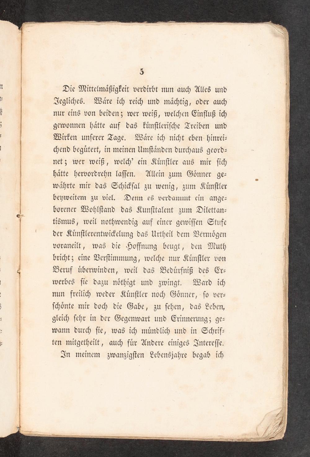 Die Mittelmäßigkeit verdirbt nun auch Alles und Jegliches. Ware ich reich und mächtig, oder auch nur eins von beiden; wer weiß, welchen Einfluß ich gewonnen hätte auf das künſtleriſche Treiben und Wirken unſerer Tage. Ware ich nicht eben hinrei- <end begütert, in meinen Umſtänden durchaus geord- netz wer weiß, welch ein Künſtler aus mir ſich hätte hervordrehn laſſen. Allein zum Gönner ge- währte mir das Schiſal zu wenig, zum Künſtler beyweitem zu viel. Denn es verdammt ein ange- borener Wohlſtand das Kunſttalent zum Dilettan- tiSmus, weil nothwendig auf einer gewiſſen Stufe der Künſtlerentwikelung das Urtheil dem Vermögen voraneilt, was die Hoffnung beugt, den Muth bricht; eine Verſtimmung, welche nur Künſtler von Beruf überwinden, weil das Bedürfniß des Er- werbes ſie dazu nöthigt und zwingt. Ward ich nun freilich weder Künſtler noc< Gönner,- ſo ver- ſchönte mir doch die Gabe, zu ſehen, das Leben, gleich ſehr in der Gegenwart und Erinnerung; ge- wann durch ſie, was ich mündlich und in Schrif- ten mitgetheilt, auch für Andere einiges Intereſſe.