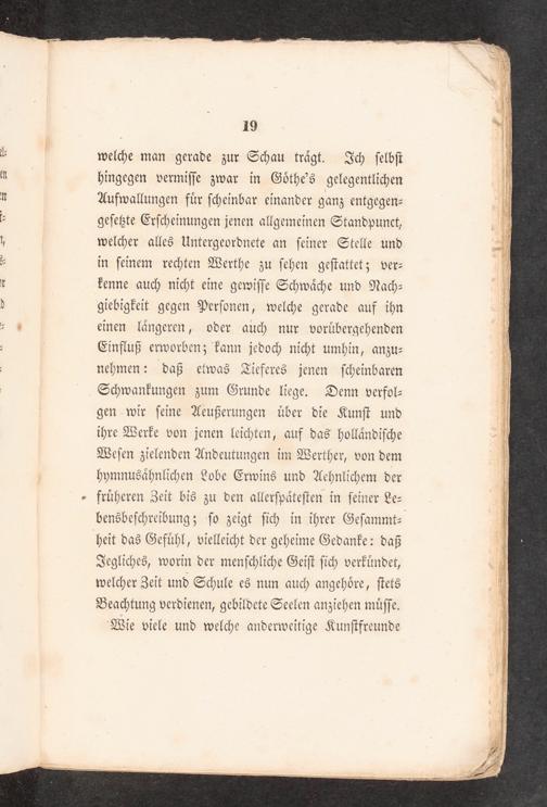 welche man gerade zur Schau trägt. Ich ſelbſt hingegen vermiſſe zwar in Göthe's gelegentlichen Aufwallungen für ſcheinbar einander ganz entgegen- geſeßte Erſcheinungen jenen allgemeinen Standpunct, welcher alles Untergeordnete an ſeiner Stelle und in ſeinem rechten Werthe zu ſehen geſtattet z ver- kenne auch nicht eine gewiſſe Schwäche und Nach- giebigkeit gegen Perſonen, welche gerade auf ihn einen längeren, oder auch nur vorübergehenden Einfluß erworben; kann jedoch nicht umhin, anzu- nehmen: daß etwas Tieferes jenen ſcheinbaren Schwankungen zum Grunde liege. Denn verfol- gen wir ſeine Aeußerungen über die Kunſt und ihre Werke von jenen leichten, auf das holländiſche Weſen zielenden Andeutungen im Werther, von dem hymnusähnlichen Lobe Erwins und Aehnlichem der früheren Zeit bis zu den allerſpäteſten in ſeiner Le- bensbeſchreibungz; ſo zeigt ſich in ihrer Geſammt- heit das Gefühl, vielleicht der geheime Gedanke: daß Jegliches, worin der menſchliche Geiſt ſich verkündet, welcher Zeit und Schule es nun auch angehöre, ſtets Beachtung verdienen, gebildete Seelen anziehen müſſe.