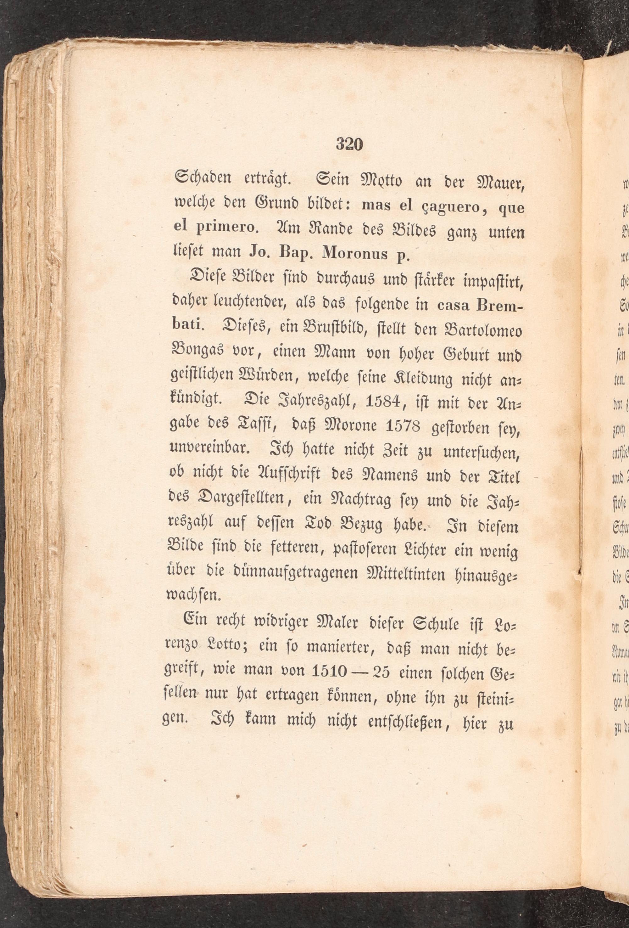 Dieſe Bilder ſind durchaus und ſtärker impaſtirt, daher leuchtender, als das folgende in casa Brem- bati. Dieſes, ein Bruſtbild, ſtellt den Bartolomeo Bongas vor, einen Mann von hoher Geburt und geiſtlichen Würden, welche ſeine Kleidung nicht an- kündigt. Die Jahreszahl, 1584, iſt mit der An- gabe des Taſſi, daß Morone 41578 geſtorben ſey, unvereinbar. I< hatte nicht Zeit zu unterſuchen, ob nicht die Aufſchrift des Namens und der Titel des Dargeſtellten, ein Nachtrag ſey und die Jah- resSzahl auf deſſen Tod Bezug habe.. In dieſem Bilde ſind die fetteren, paſtoſeren Lichter ein wenig über die dünnaufgetragenen Mitteltinten hinausge- wachſen.