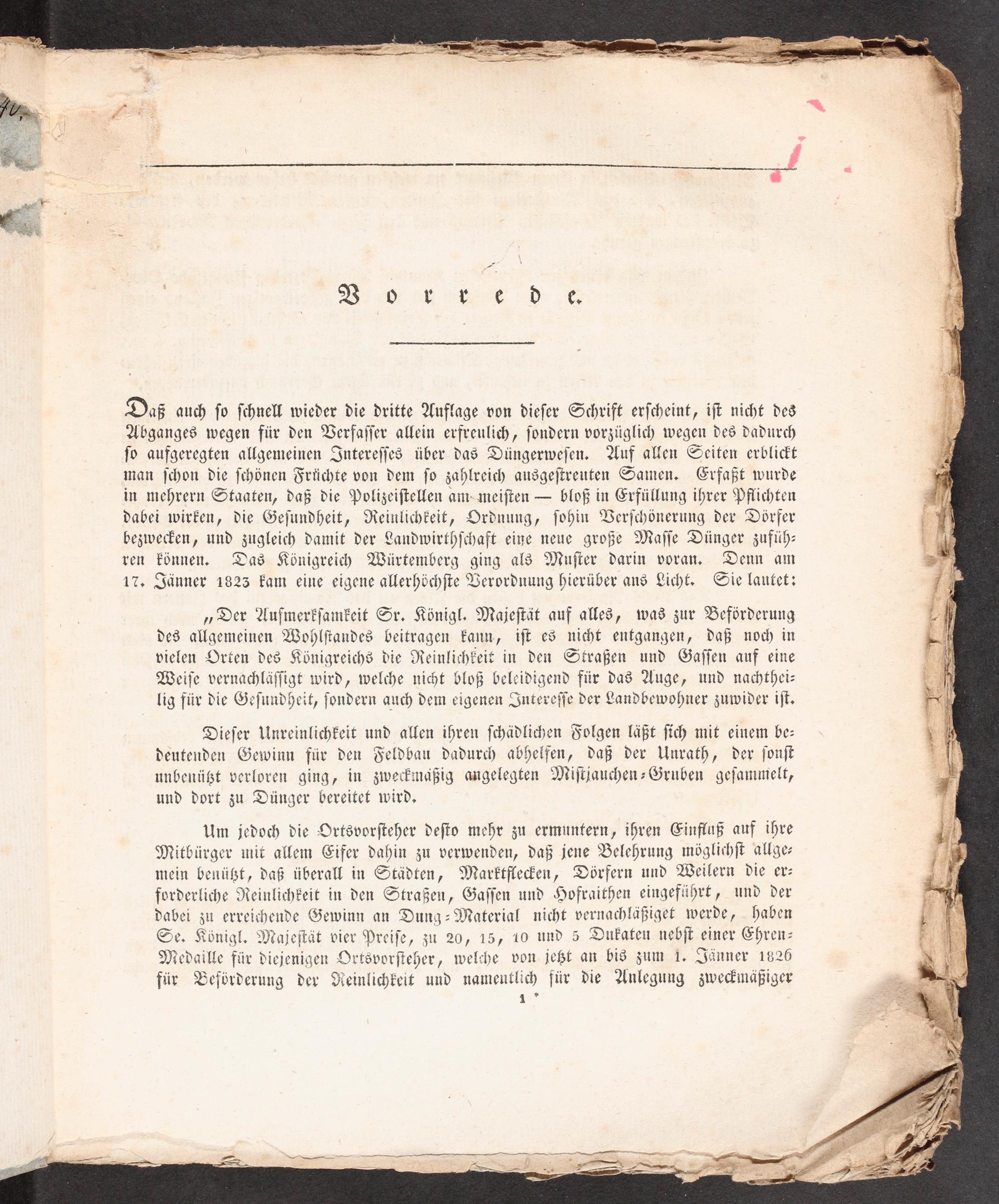 „Der Auſmerkſamkeit Sr, Königl. Majeſtät auf alles, was zur Beförderung des allgemeinen Wohlſtandes beitragen kann, iſt es nicht entgangen, daß noch in vielen Orten des Königreichs die Neinlichkeit in den Straßen und Gaſſen auf eine Weiſe vernachläſſigt wird, welche nicht bloß beleidigend für das Auge, und nachthei- lig für die Geſundheit, ſondern auch dem eigenen Intereſſe der Landbewohner zuwider iſt.