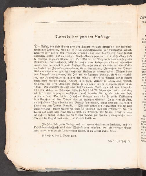 Der Beifall, den dieſe Schrift über den Dünger bei allen literariſch- und landwirth- ſchaftlichen Inſtituten, dann bei ſo vielen Geſchäftsmännern und Landwirthen erhielt, beſonders aber das ſo ſehr erfreuliche Ergebniß, daß nach Würtemberg einige hundert Exemplare gingen, und die dortigen Buchhandlungen ſchrieben, dieſe Abhandlung ſinde da deßwegen ſo großen Abſaß, weil Se. Majeſtät der König=“- bekannt als ſo großer Proteetor der Landwirthſchaft, ſelbſt bei verſchiedenen Gelegenheiten darauf aufmerkſam machte, bewirkten ſchnell die zweite Auflage. Angenehm war es mir auch, auf allen Seiten von Laundwirthen Zuſchriften zu empfangen, die mir das aufgeregte Intereſſe bei dem Dünger- Weſen und ihre neuen glücklich angeſtellten Verſuche zu erkennen gaben. Mehrere haben ihre Düngerſtätten geordnet, die Höfe und die Dorfwege gereinigt, die Gülle einzufüh- ren, und Kompoſidünger zu machen ſich beſtrebt, Selbſt in Städten und in Flecken unternahmen einzelne Bürger, Pfüßen zu trocknen, Abtritte zu leeren, allen Schatt, die Abfälle und jeden ſchmußigen Haufen zu ſammeln, und ſo Düngermagazine zu er- richten. Sie erlangten Anfangs alles dieſes umſonſt. Bald zeigte ſich nun Eiferſucht. Es boten Andere-=- Zahlungen daſür, ſo, daß ſelbſt Verſteigerungen darüber eintraten, und der bisher ſo ganz vernachläßigte Unrath in vollen Werth, oder wie man ſagt, zu Shren kam. Nur bei der Hauptſtadt München machte die ſo grelle Schilderung ihres Unweſens mit dem Dünger nicht den geringſten Eindruck. Ja es dient die Iſar, mit kriſtallenen Wogen herrlich vom Gebürge ſchwemmend, immer noch zum allgemeinen Abtritt und zum Dünger- Magazin,-- Mit allem Unrath hochgeſchwängert muß ſie dieſe Stadt verlaſſen, welche dadurch von ſelbſt ſich ſchändlich ſtraft und brandmarkt, daß kein Waſſer das ganze Jahr durch klar da fiießt, die Brunnen,"wie die Luft verpeſtet, jähr- lich mehrere tauſend Gulden aus der Bürger Taſchen zum Fenſter hinausgeworfen wer- den, und die Gegend weit umher eine Steppe bleibt,--