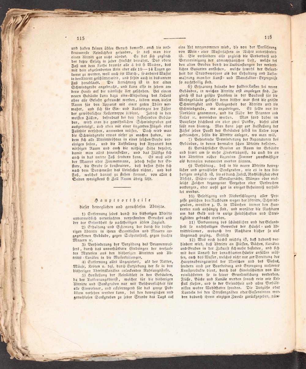 12) Was3 noch höchſt wichtig iſt, daß dadurch ver- hindert wird, daß Ubtritte an Flüſſen, Bächen, Kanälett und Gruben in der Zukunft ſich mehr beſinden, und ſich mit dem Unrath der benachbarten Häuſer anfüllen müſ- ſen, auch das Waſſer, welches nicht nur zur Bereitung der Hauptnahrungsmittel der Menſchen und des Viebes, ſondern auch zur Bearbeitung und Erzeugung tüehrerer Kunſtprodukte dient, durc<g das Hineinſchütten von Un- reinlichfeiten ſo in ſeiner Grundmiſchung verderben« Tlüße, Bäche und Kanäle werden ſonach rein wie Kri- ſtall fließen, und ſo der Geſundheit und alen Verhält- niſſen wahre Wohlthaten ſpenden. Die Uusgüße oder Kandeln bei den Straßengräben oder Gajſenrinnen wer» den dadurch ihrem einzigen Zwecte zurückgegeben,„näm“