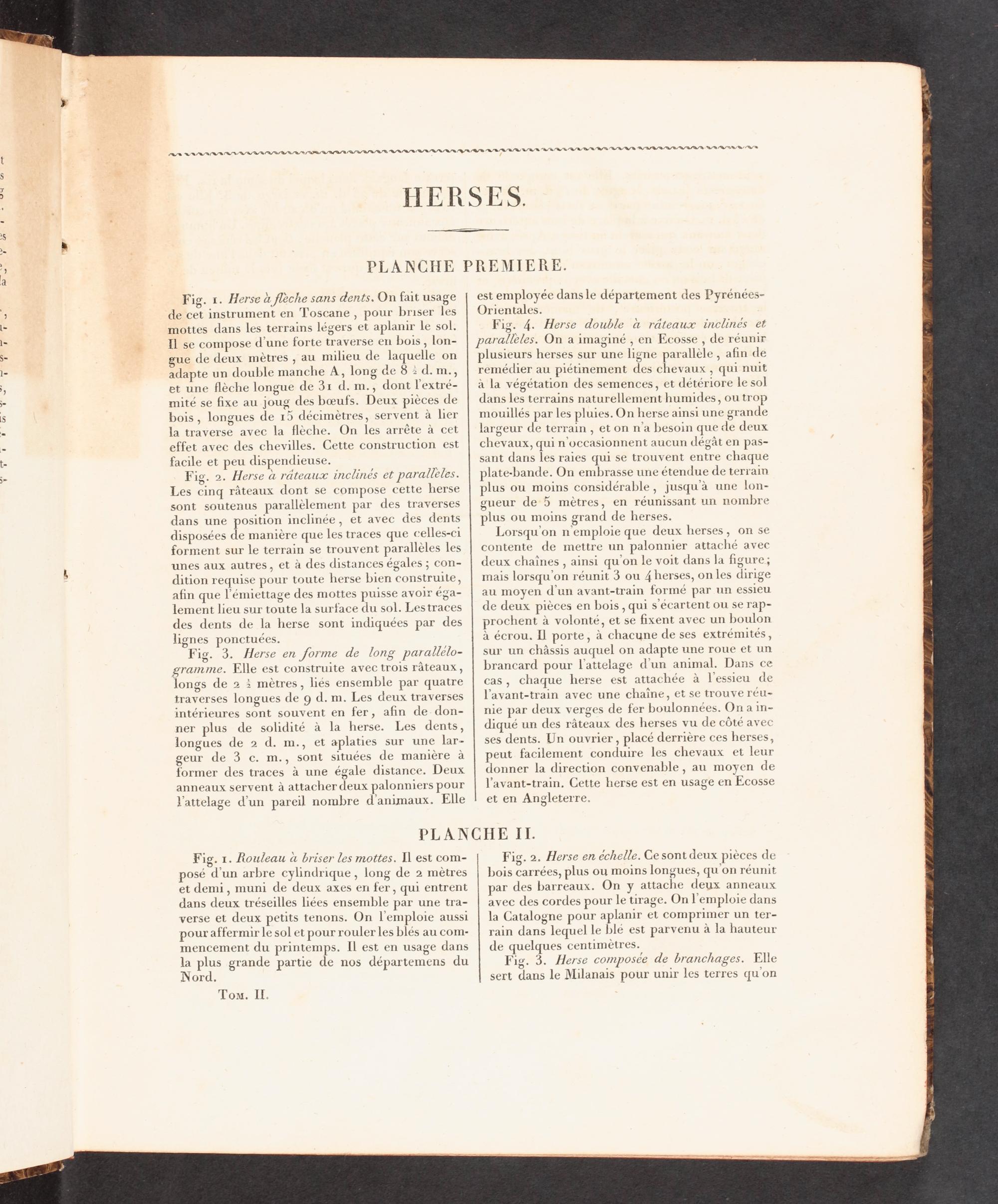 Fig. 2. Herse en echelle. Ge sont deux pièces de bois carrées, plus ou moins longues, qu on réunit par des barreaux. On y attache deux anneaux avec des cordes pour le tirage. On l'emploie dans la Catalogne pour aplanir et comprimer un ter- rain dans lequel le blé est parvenu à la hauteur de quelques centimètres.