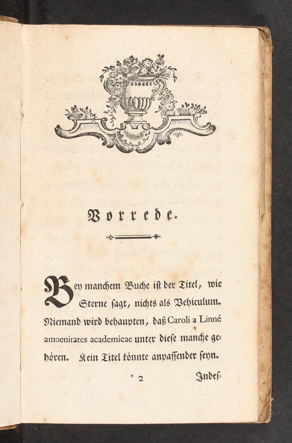 ey manchem Buche iſt der Titel, wie Sterne ſagt, nichts als Behiculum, Niemand wird behaupten, daß Caroli 2 Linne amoenitates academicae unter dieſe manche ge- hören. Kein Titel könnte anpaſſender ſeyn.