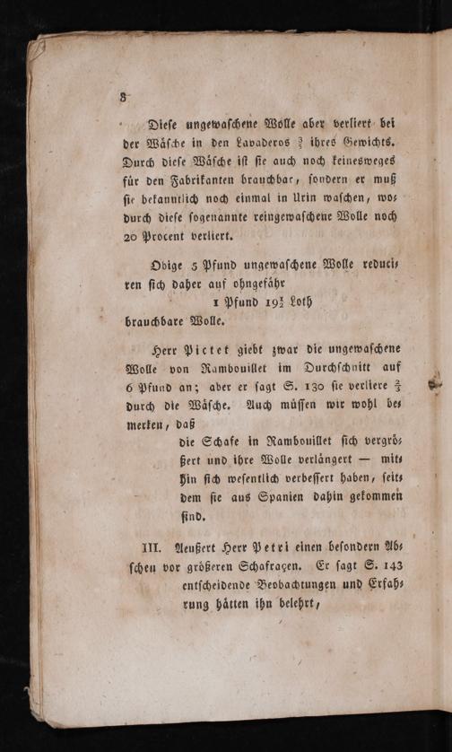 Herr Pictet giebt zwar die ungewaschene Wolle von Rambouillet im Durchschnitt auf 6 Pfund an; ader er sagt S. 130 sie verliere 3 durch die Wäsche. Auch müssen wir wohl be— merken, daß