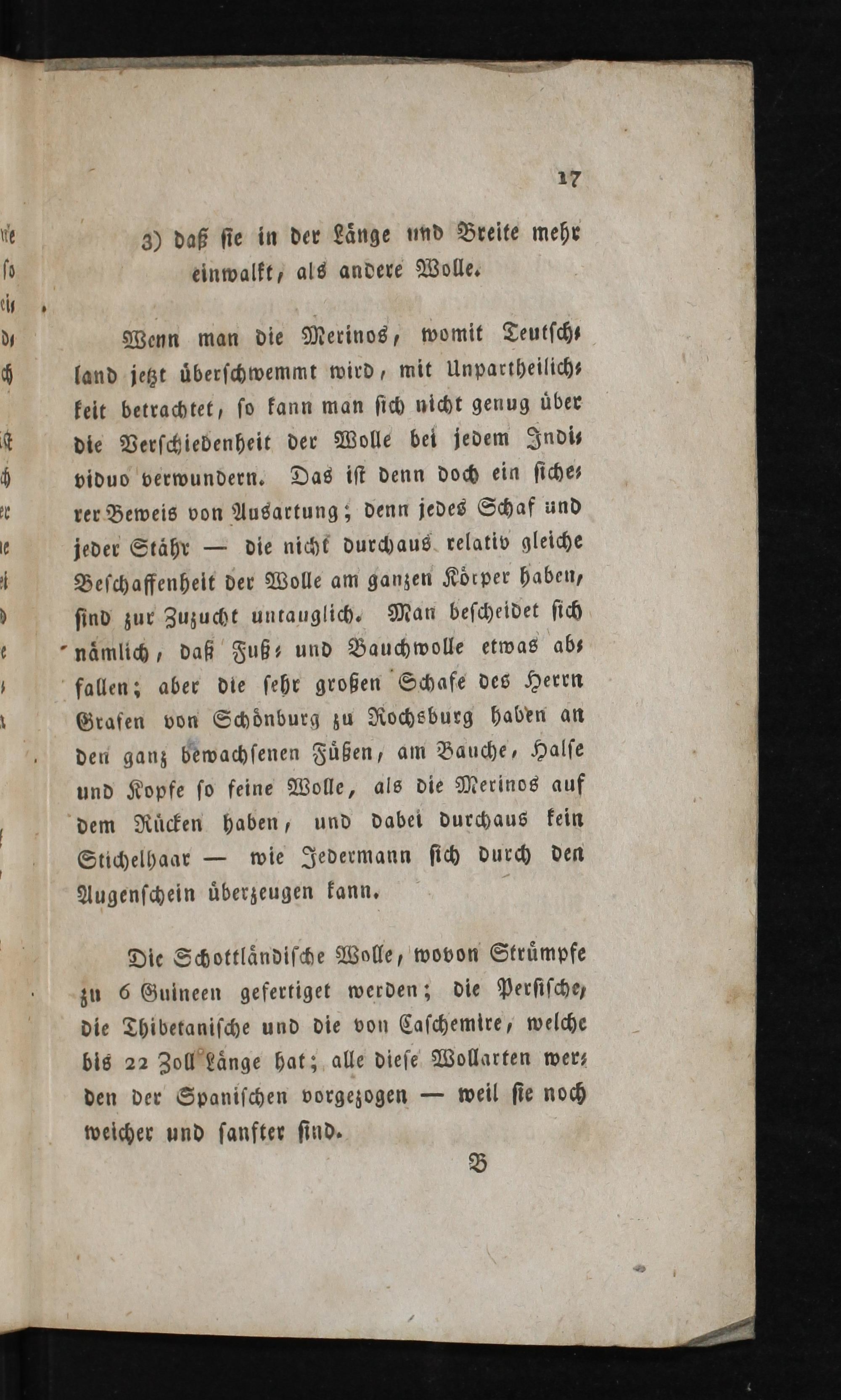 Die Schottländische Wolle, wovon Strümpfe zu 6 Guineen gefertiget werden; die Persische, die Thibetanische und die von Caschemire, welche bis 22 Zoll Länge hat; alle diese Wollarten wer⸗ den der Spanischen vorgezogen— weil sie noch