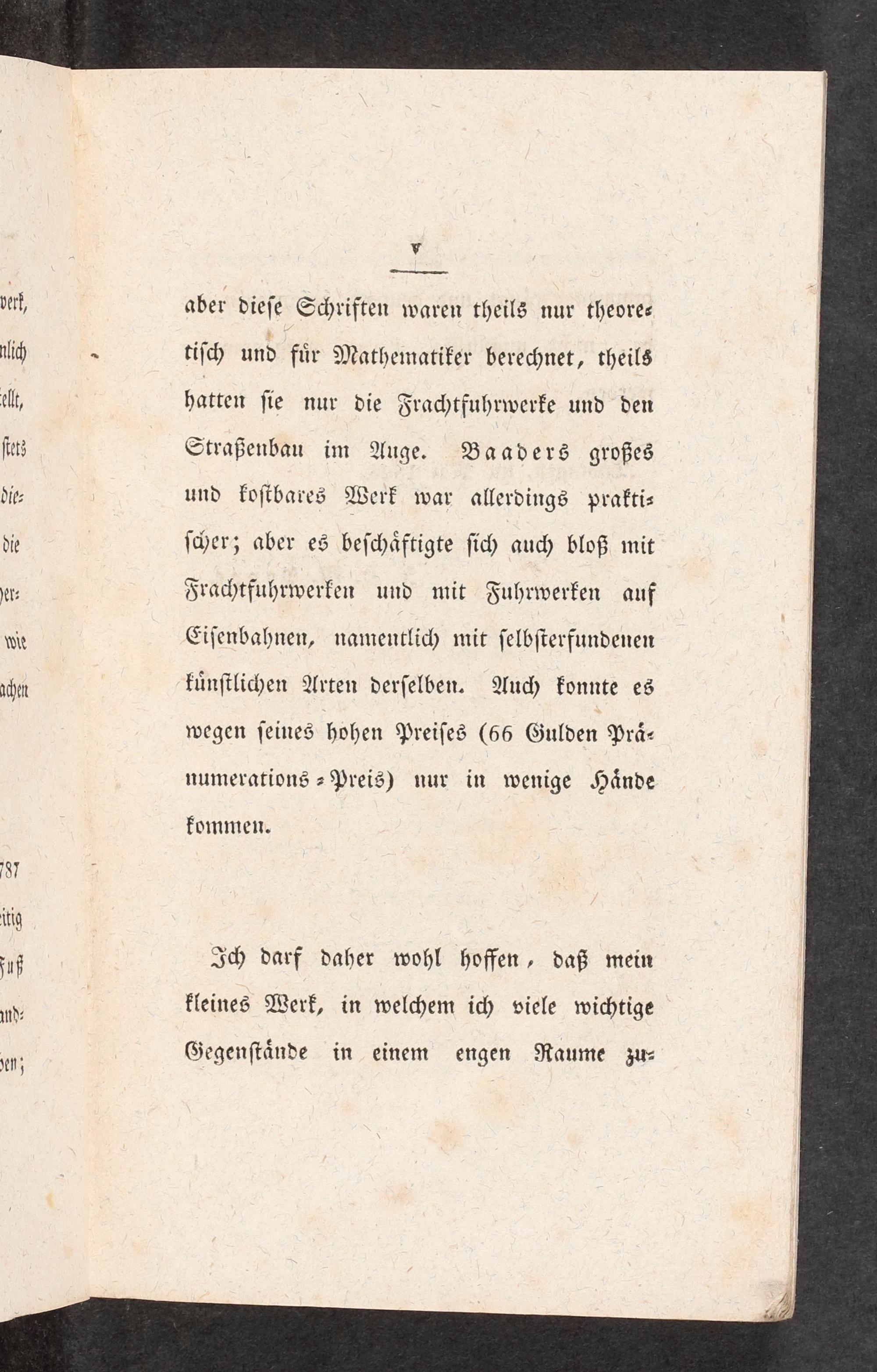 aber diese Schriften waren theils nur theore— tisch und für Mathematiker berechnet, theils hatten sie nur die Frachtfuhrwerke und den Straßenbau im Auge. Baaders großes und kostbares Werk war allerdings prakti— scher; aber es beschäftigte sich auch bloß mit Frachtfuhrwerken und mit Fuhrwerken auf Eisenbahnen, namentlich mit selbsterfundenen künstlichen Arten derselben. Auch konnte es wegen seines hohen Preises(66 Gulden Prä— numerations-Preis) nur in wenige Hände