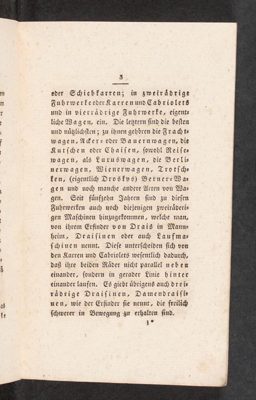 oder Schiebkarren; in zweirädrige Fuhrwerkeoder Karren und Cabriolets und in vierrädrige Fuhrwerke, eigent⸗ liche Wagen, ein. Die letztern sind die besten und nützlichsten; zu ihnen gehͤren die Frach t⸗ wagen, Acker- oder Bauernwagen, die Kutschen oder Chaisen, sowohl Reise— wagen, als Luxuswagen, die Berli⸗ nerwagen, Wienerwagen, Trotsch— ken,(eigentlich Droskys) Berner-Wa⸗ gen und noch manche andere Arten von Wa— gen. Seit fünfzehn Jahren sind zu diesen Fuhrwerken auch noch diejenigen zweiräderi— gen Maschinen hinzugekommen, welche man, von ihrem Erfinder von Drais in Mann⸗ heim, Draisinen oder auch Laufma— schinen nennt. Diese unterscheiden sich von den Karren und Cabriolets wesentlich dadurch,