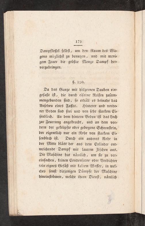 Da das Ganze mit hölzernen Dauben ein— gefaßt ist, die durch eiserne Reifen zusam— mengebunden sind, so erhält es beinahe das Ansehen eines Fasses. Hinterer und vorde— rer Boden sind frei und von sehr starkem Ei— senblech. An dem hintern Boden ist das Loch zur Feuerung angebracht, und an dem vor— dern der gekröpfte oder gebogene Schornstein, der eigentlich nur ein Rohr von starkem Ei— senblech ist. Durch ein anderes Rohr in der Mitte bläst der aus dem Cylinder ent— weichende Dampf mit lautem Zischen aus. Die Maschine hat nämlich, um sie zu ver— einfachen, keinen Condensator oder Verdichter lein eignes Gefäß mit kättem Wasser, in wel— ches sonst diejenigen Dämpfe der Maschine hineinstromen, welche ihren Dienst, nämlich