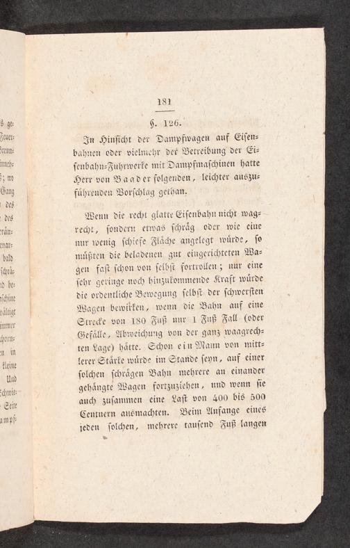 Wenn die recht glatte Eisenbahn nicht wag⸗ recht, sondern etwas schräg oder wie eine nur wenig schiefe Fläche angelegt würde, so müßten die beladenen gut eingerichteten Wa⸗ gen fast schon von selbst fortrollen; nur eine sehr geringe noch hinzukommende Kraft würde die ordentliche Bewegung selbst der schwersten Wagen bewitken, wenn die Bahn auf eine Strecke von 180 Fuß nur 1 Fuß Fall(oder Gefälle, Abweichung von der ganz waagrech⸗ ten Lage) hätte. Schon ein Mann von mitt⸗ lerer Stärke würde im Stande seyn, auf einer solchen—0 Bahn mehrere an einander gehängte Bagen fortzuziehen, und wenn sie auch zusammen eine Last von 400 bis 500 Centnern ausmachten. Beim Anfange eines jeden solchen, mehrere tausend Fuß langen
