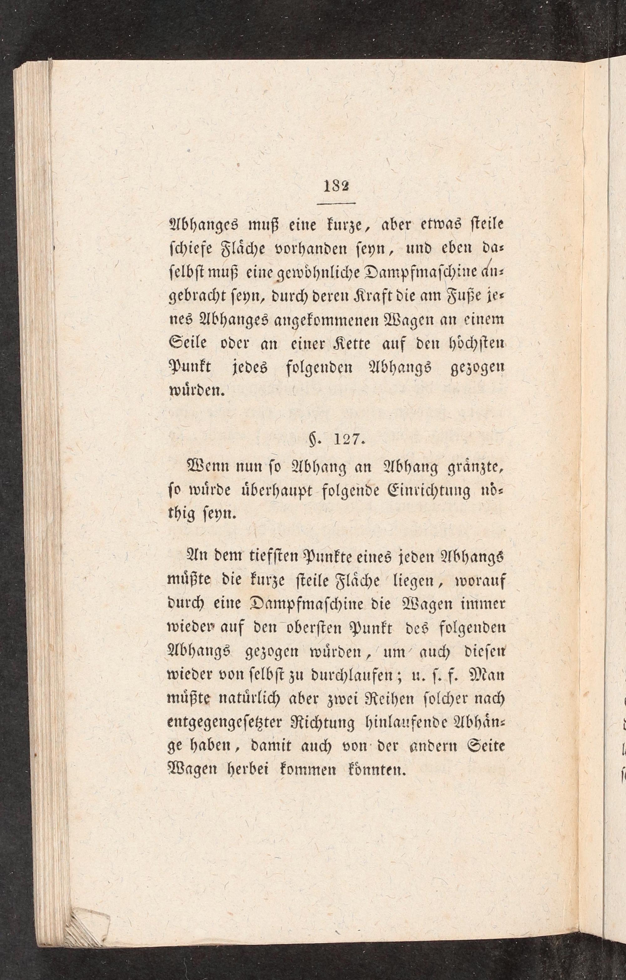 Abhanges muß eine kurze, aber etwas steile schiefe Fläche vorhanden seyn, und eben da— selbst muß eine gewöhnliche Dampfmaschine an⸗ gebracht seyn, durch deren Kraft die am Fuße je— nes Abhanges angekommenen Wagen an einem Seile oder an einer Kette auf den höchsten Punkt jedes folgenden Abhangs gezogen würden.