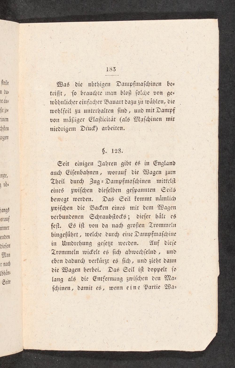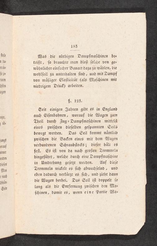 Seit einigen Jahren gibt es in England auch Eisenbahnen, worauf die Wagen zum Theil durch Zug-Dampfmaschinen mittelst eines zwischen dieselben gespannten Seils bewegt werden. Das Seil kommt nämlich zwischen die Backen eines mit dem Wagen verbundenen Schraubstocks; dieser hält es fest. Es ist von da nach großen Trommeln bingeführt, welche durch eine Dampfmaschine in Umdrehung gesetzt werden. Auf diese Trommeln wickelt es sich abwechselnd, und eben dadurch verkürzt es sich, und zieht dann die Wagen herbei. Das Seil ist doppelt so lang als die Entfernung zwischen den Ma— schinen, damit es, wenn eine Partie Wa⸗